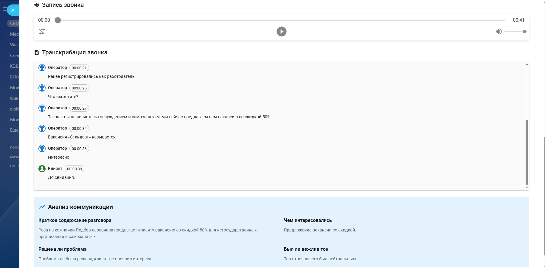 - Не просто расшифровка, а анализ смысла: ИИ выделяет ключевые моменты, возражения, намерения клиента.