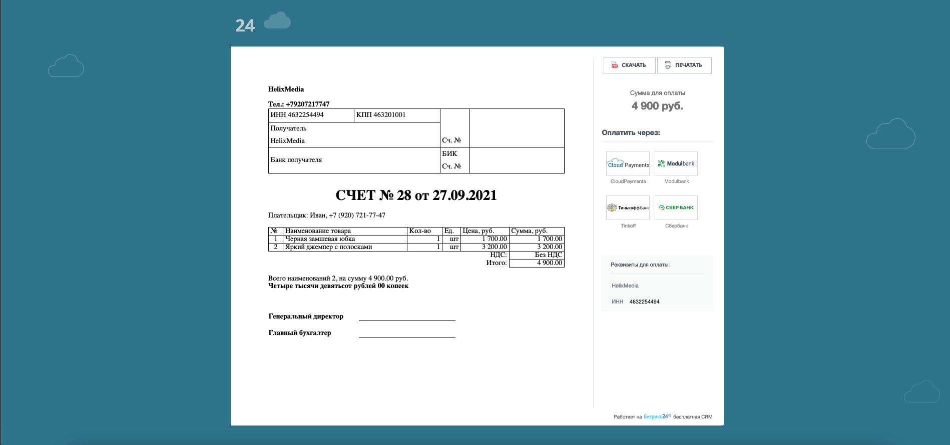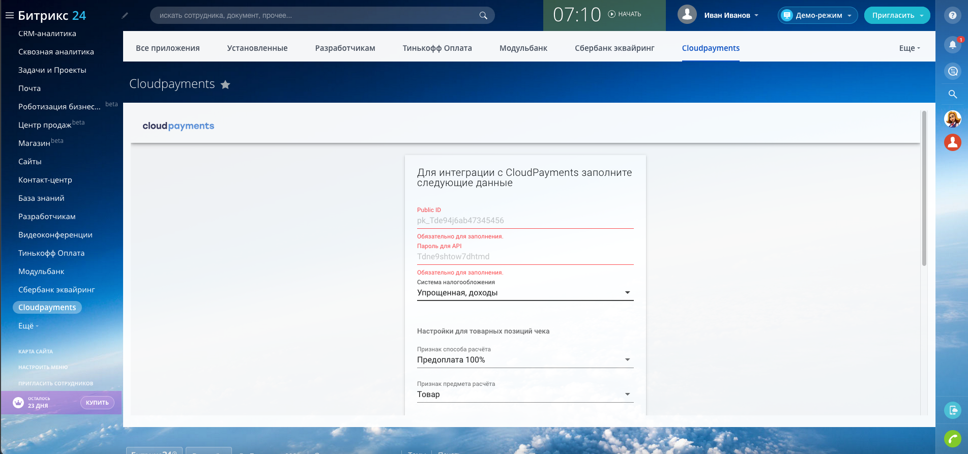 Очень доволен платежным модулем CloudPayments от HELIX для Битрикс24. Устанавливается легко, все работает сразу и без сбоев.