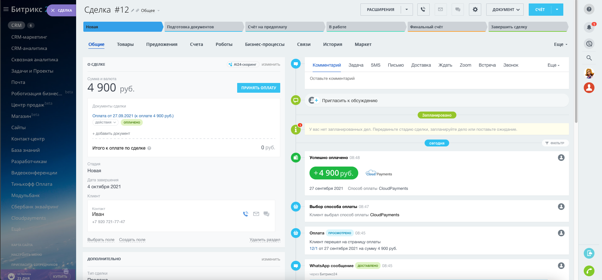 - Всегда актуальное состояние платежа в Timeline сделки или заказа.
