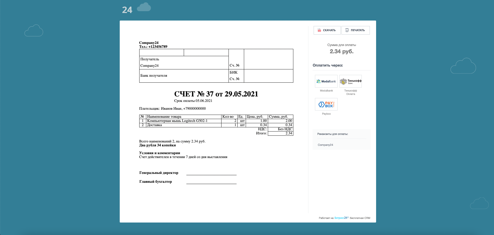 - Прием платежей на веб-форме счета и в интернет-магазине Битрикс24