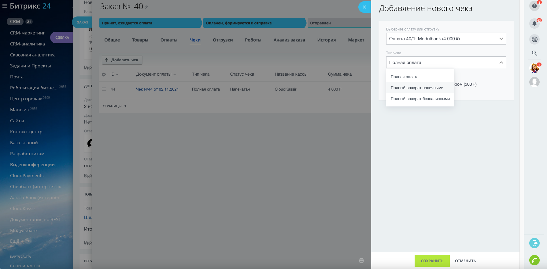 Формирование электронных чеков при покупке в интернет-магазине или при оплате счета через платежную систему в Битрикс24.