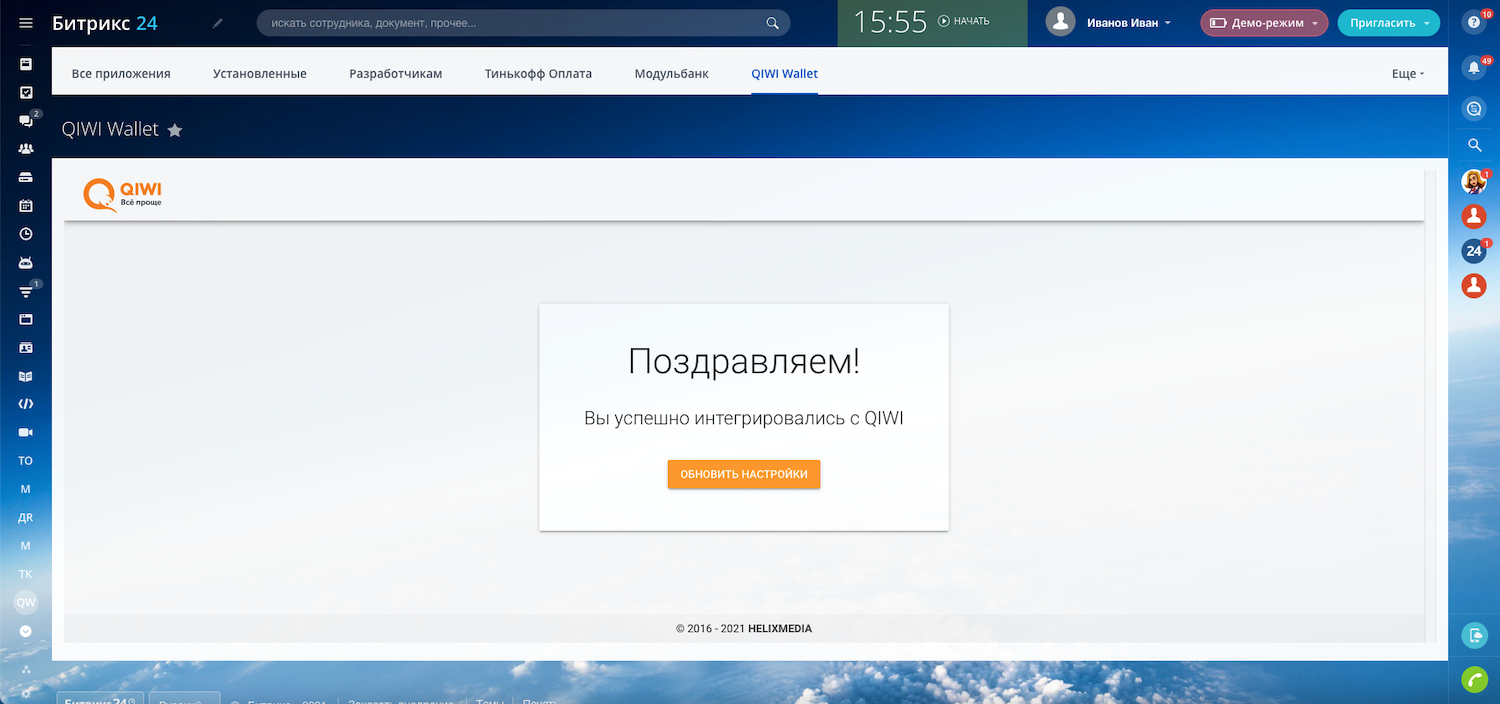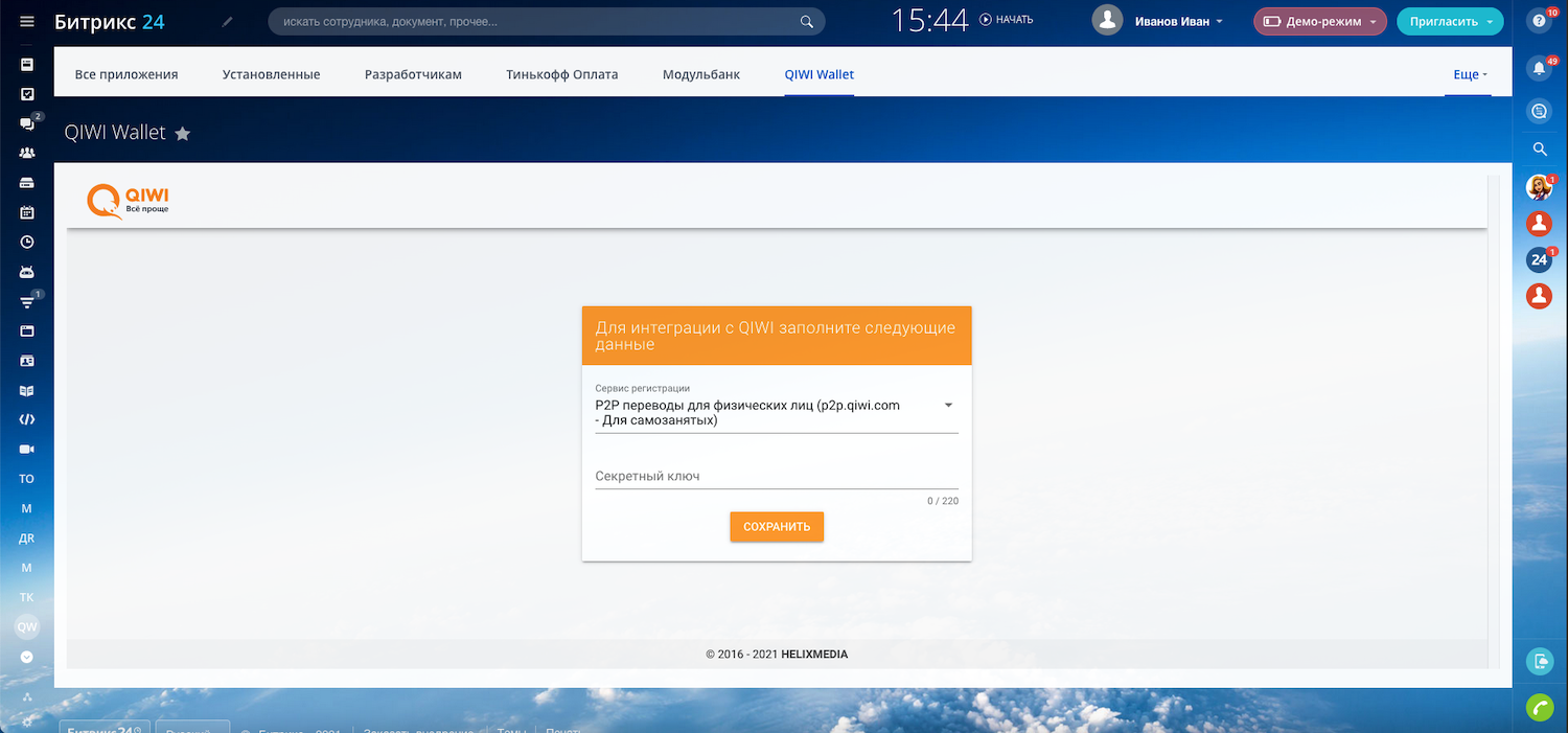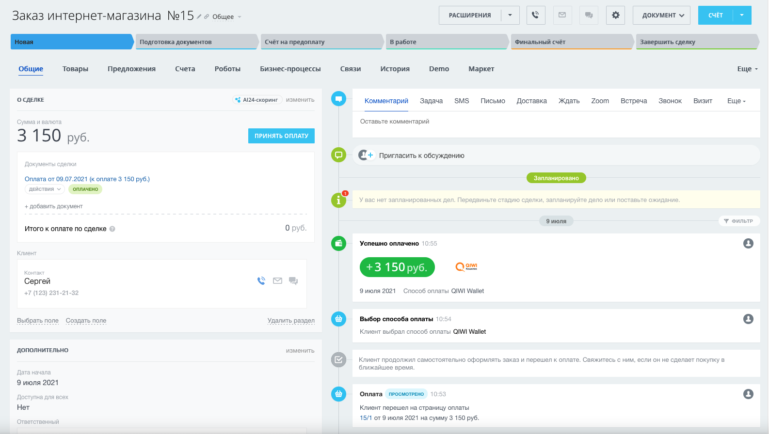 - Прием платежей из сделки по клику на кнопку «Принять оплату».