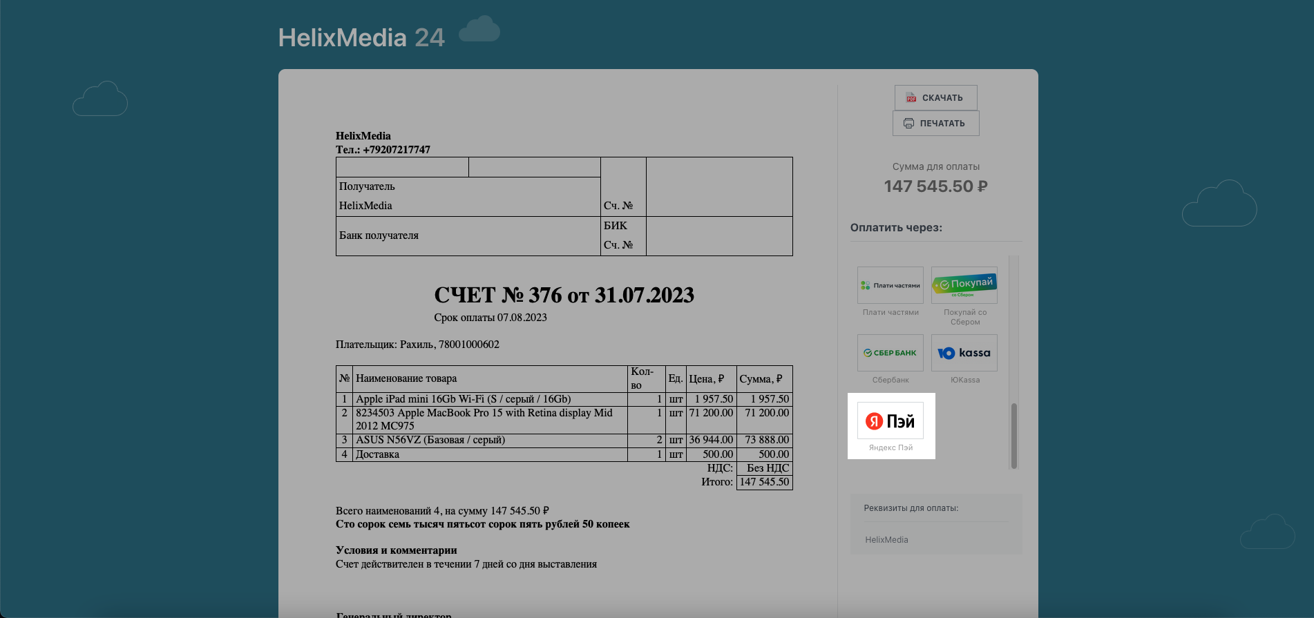 - Автоматическая установка и настройка способов оплаты для счетов и заказов.