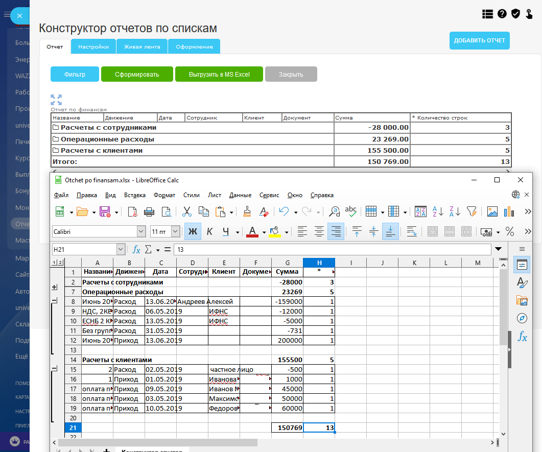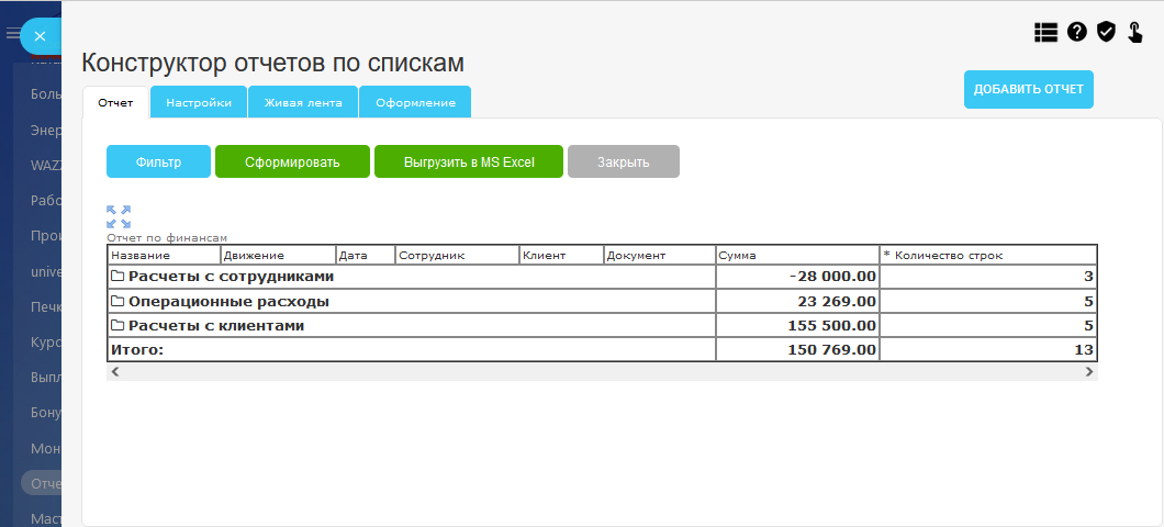 Конструктор отчетов по универсальным спискам. Выгрузка отчета в MS Excel.