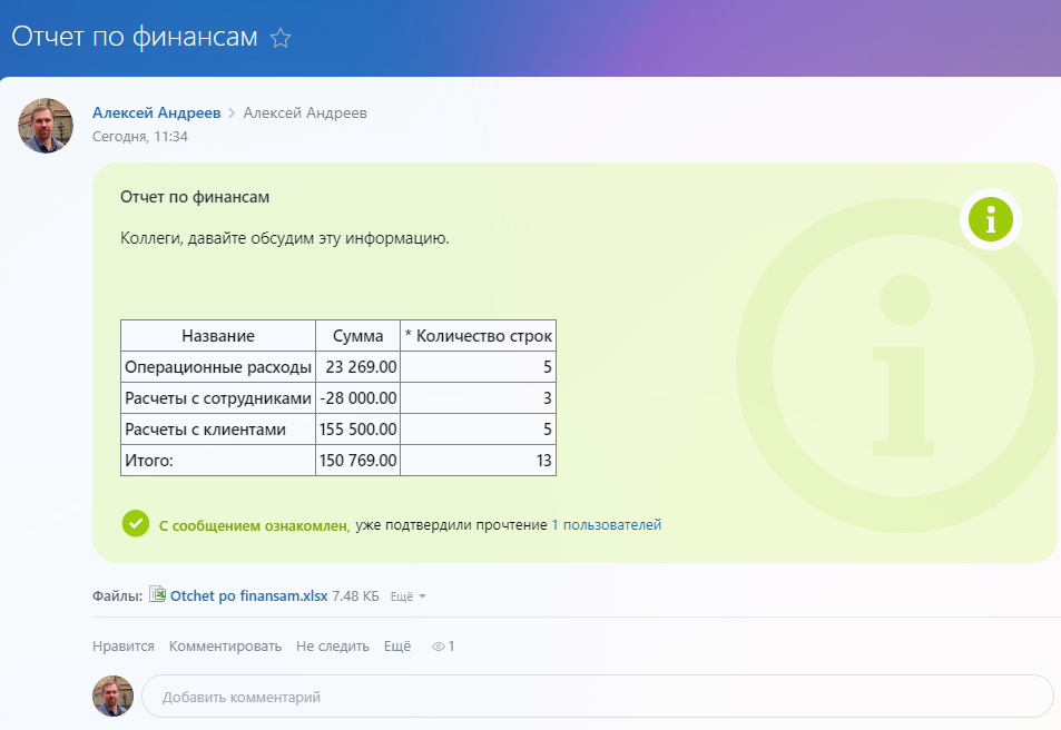 - Публикация в живую ленту. Удобная коммуникация с коллегами, возможность совместно работать над данными отчета и предлагать новые сценарии развития. Отчет может быть опубликован непосредственно в сообщении и прикреплен файлом.