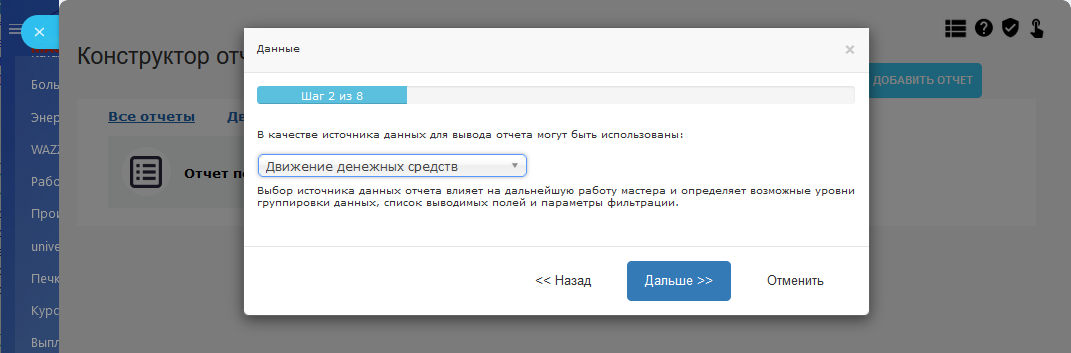 Настройка отчета. В панели настроек можно управлять уровнями группировок данных, выводом колонок и полями для отбора данных.