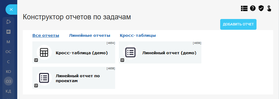 Список отчетов содержит все настроенные шаблоны отчетов. Можно добавить произвольное количество отчетов.