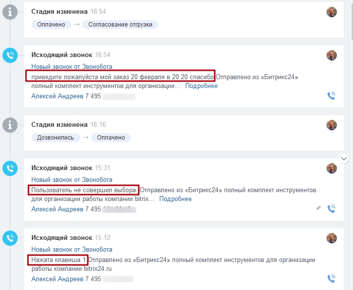 Все звонки и ответы пользователя сохраняются в стандартной карточке звонка.