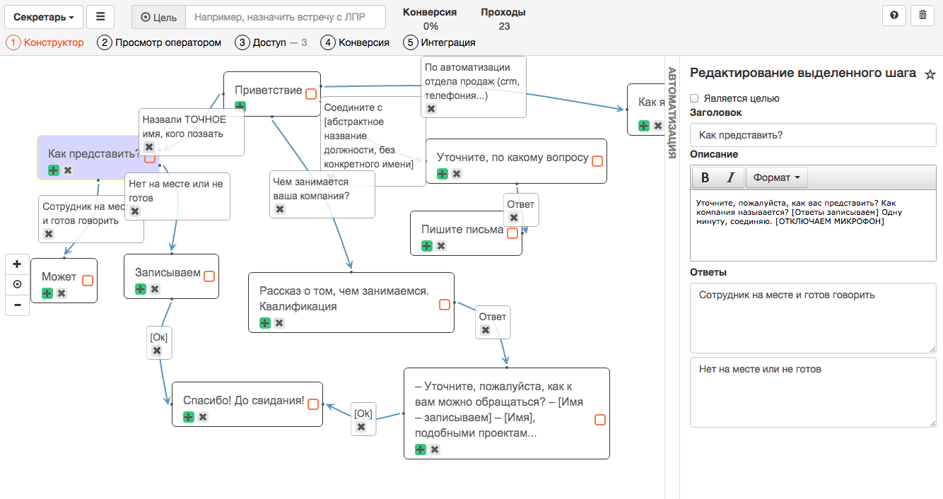 - Экономьте время менеджеров: данные из контактов в CRM автоматически подставляются в скрипт; автоматическая постановка задач при проходе определенных шагов скрипта поможет сдержать обещания перед клиентами