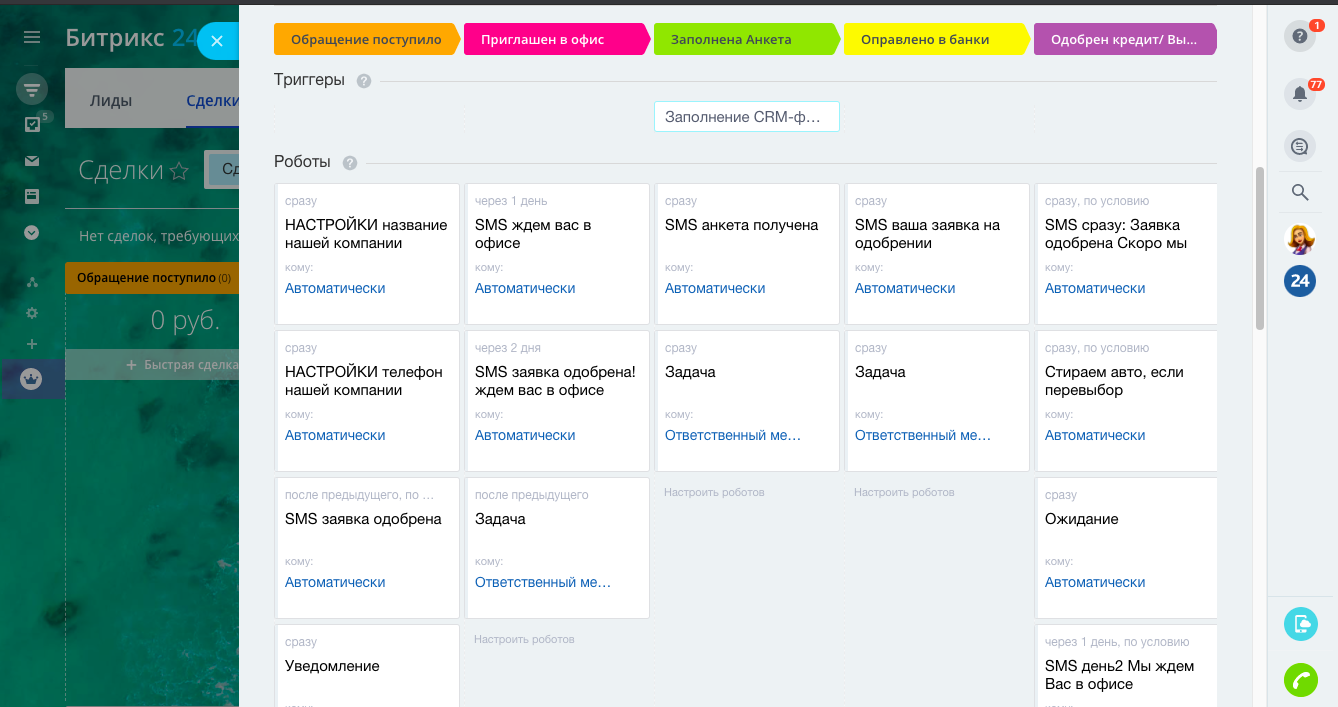 Решение АВТО КРЕДИТ подходит для большинства компаний, которые занимаются куплей - продажей автомобилей, автоброкерам, автосалонам и тем, кто помогает своим клиентам купить авто в кредит. В системе уже есть все необходимые поля для работы с автокредитованием и лизингом. Важные смс уведомления клиентам участвуют в сценариях автоматизации. Создаются все дополнительные связи заемщика: супруг/а, руководитель, прочее контактное лицо и остаются в вашей клиентской базе. Сотрудникам ставятся задачи в автоматическом режиме с напоминанием целевых действий. Отлавливаются действия клиента. Например, клиент получит смс, когда отправил заявку или заполнил анкету для банка.