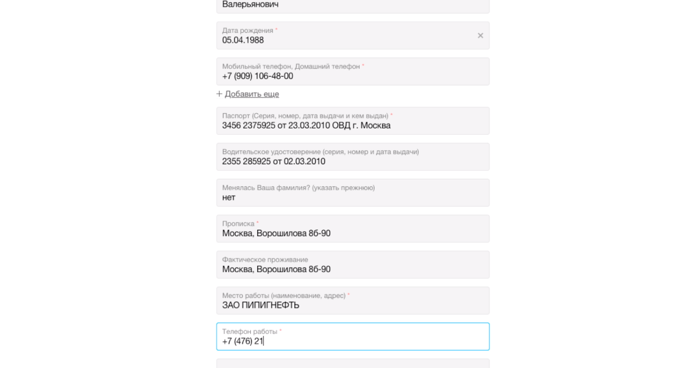 В системе уже есть все необходимые поля для работы с заемщиком и его контактными лицами. Поля, которые участвуют в сценариях автоматизации являются обязательными для заполнения.