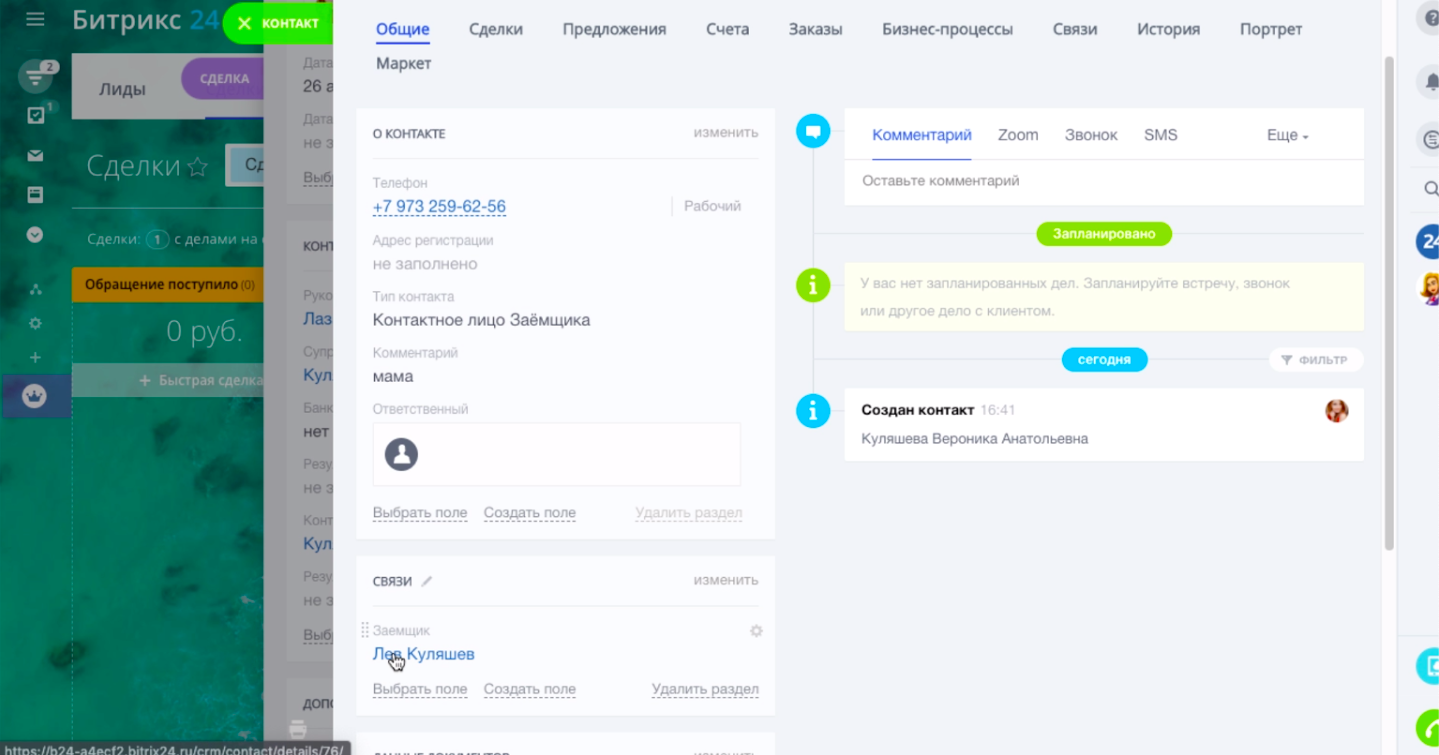- Автоматическое прикрепление информации контактных лиц заемщика