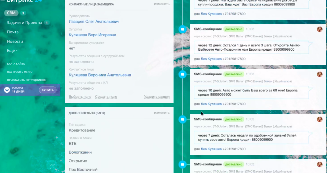 - Автоматическая отправка цепочек смс сообщений клиентам