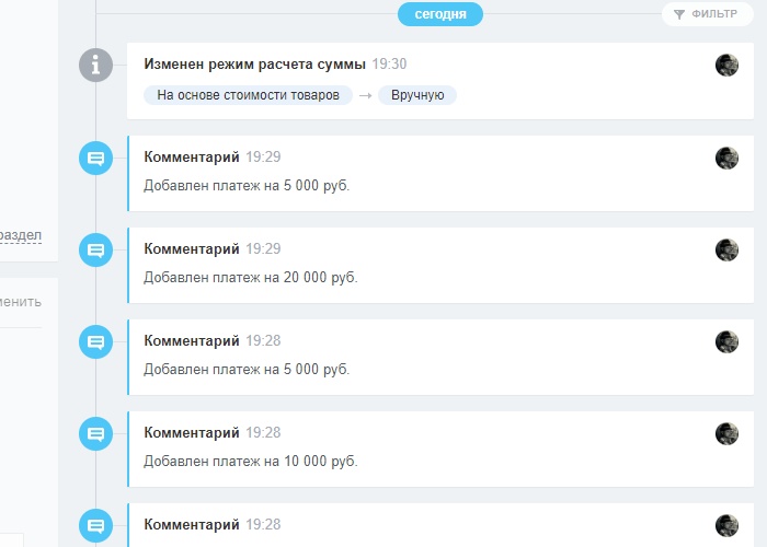 - Информация внесенная в поле - дублируется комментарием в таймлайн карточки сущности.