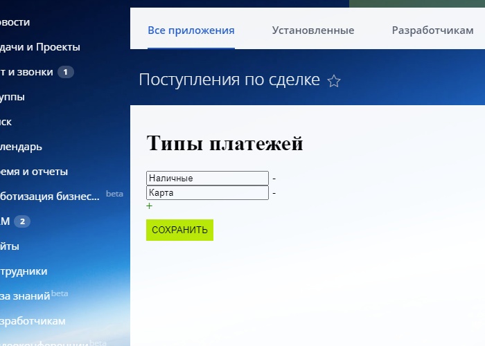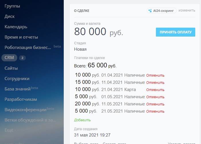 - При это можно сохранять платежи в карточке сделки с указанием даты, и вида платежа.