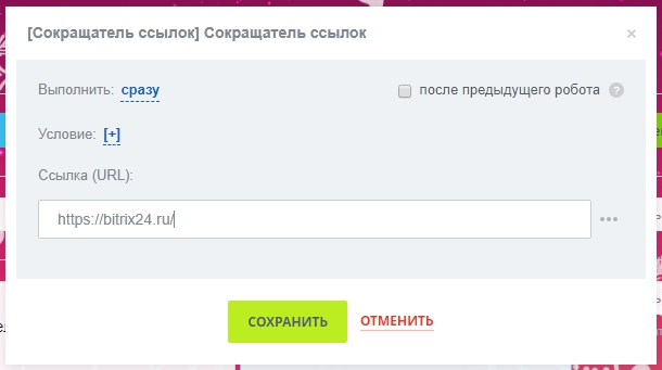 - Передаёте в настройках робота адрес ссылки, которую нужно сократить