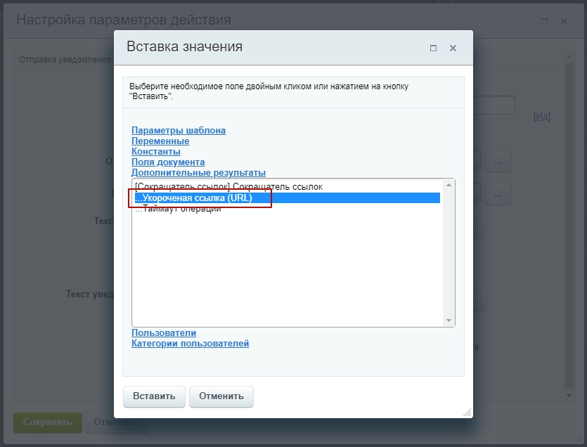 - Добавляете действие бизнес-процесса в дизайнере бизнес-процессов: Действия приложений -> [Сокращатель ссылок]