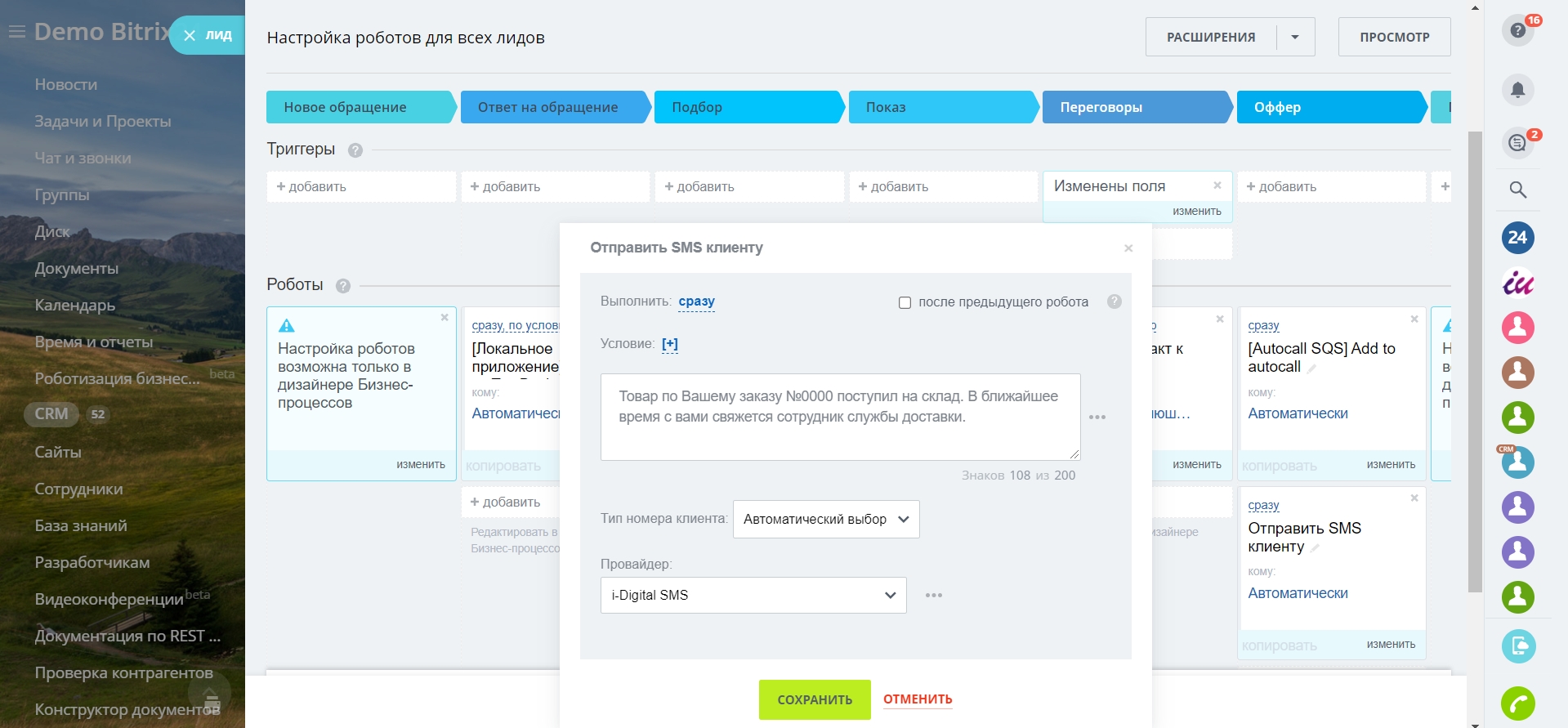 Отправка SMS сообщений из бизнес-процессов, роботов и карточек CRM.