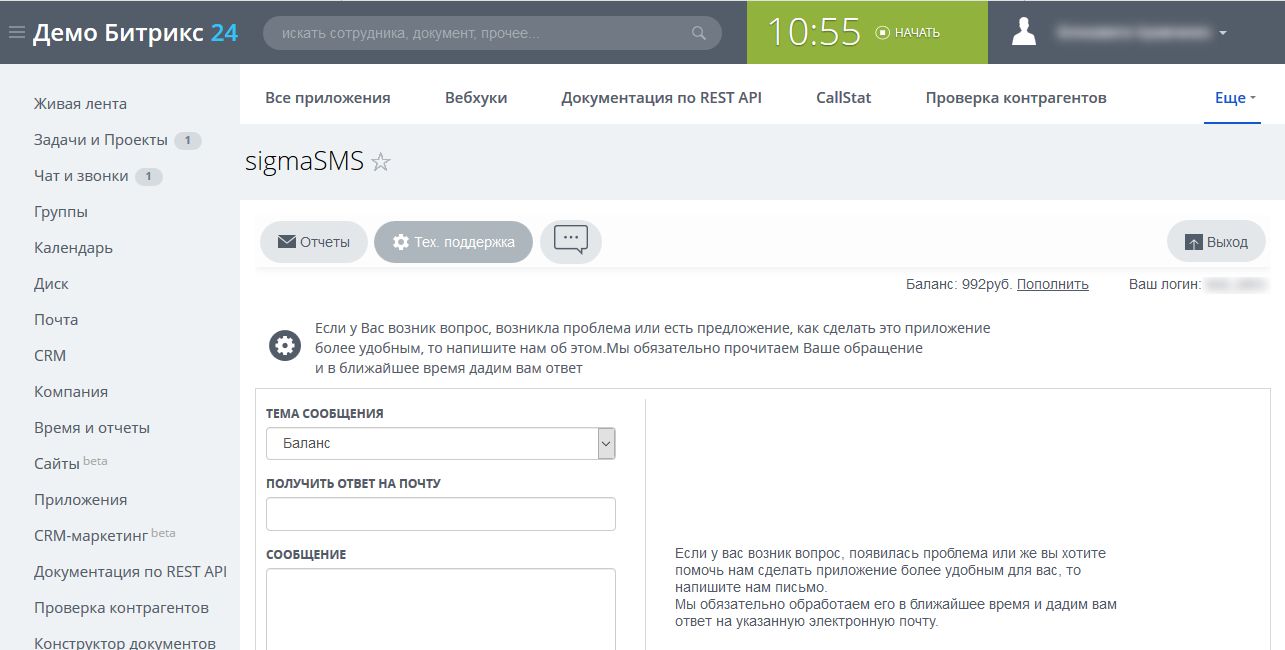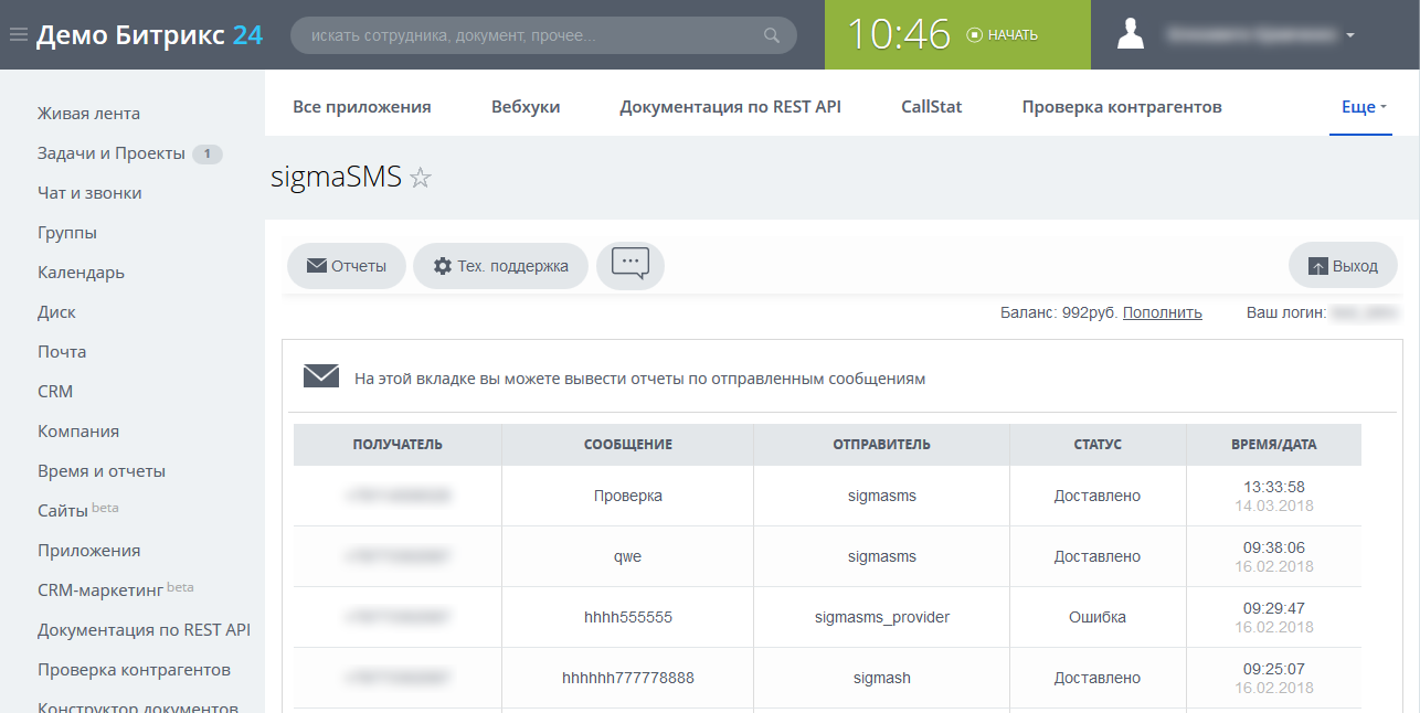 Приложение позволяет объединить функционал облачной платформы рассылок сервиса SIGMA messaging и Битрикс24. Пользователям доступны основные услуги для оповещения клиентов и сотрудников с помощью СМС. Имеется доступ к полной статистике рассылок.