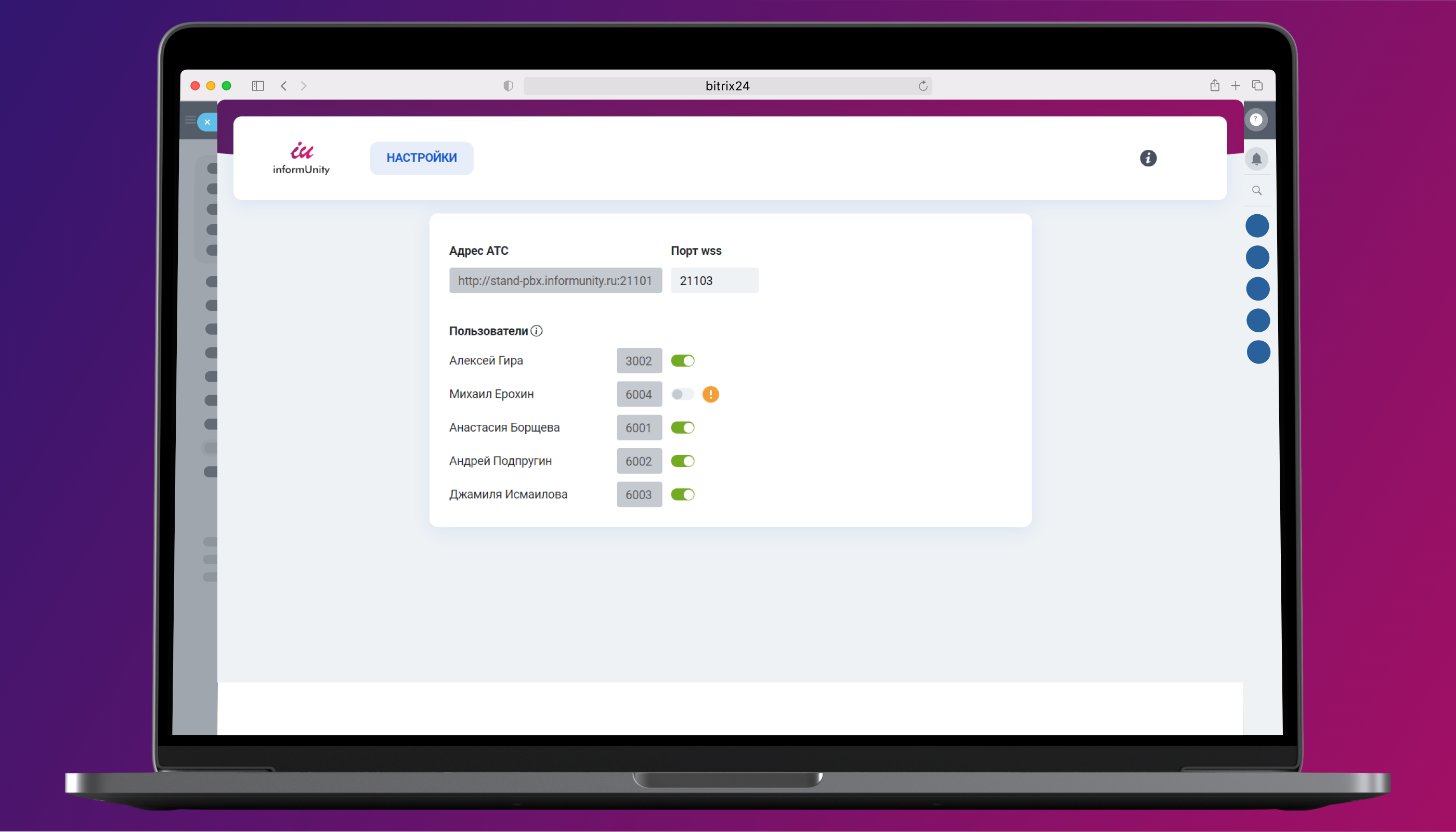 Больше не нужно устанавливать дополнительного ПО на компьютеры пользователей — укажите у сотрудника в Битрикс24 короткий номер, активируйте учетную запись в настройках Софтфон24 и он сможет звонить и принимать звонки прямо из браузера!