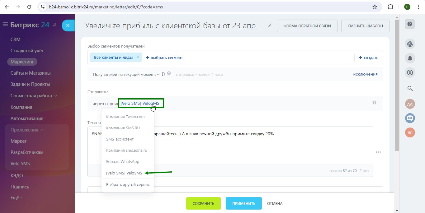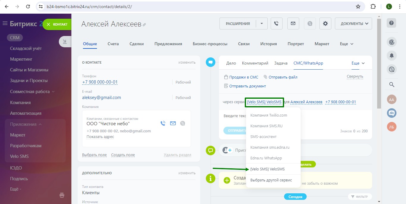 VeloSMS – поставщик услуг отправки SMS сообщений. Отправляйте SMS из объектов Компания, Сделка, Контакт, Лид и Маркетинг.