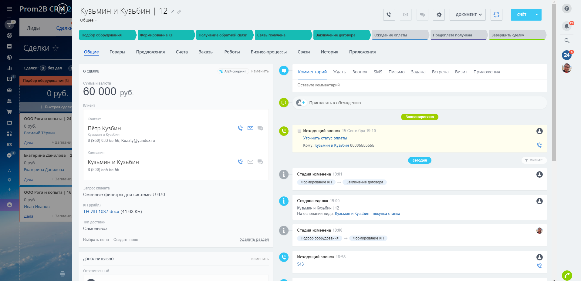 - Автоматизированная поддержка сотрудников по воронке Сделок: от подбора оборудования и формирования КП до заключения договора и получения оплаты;