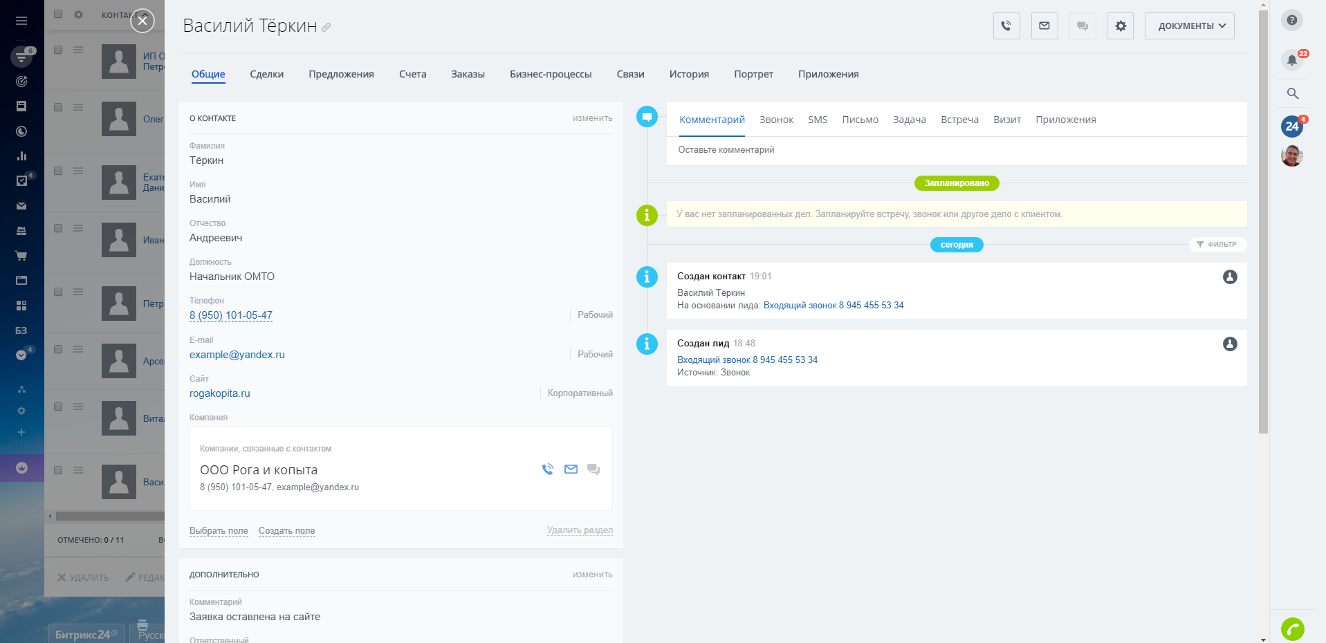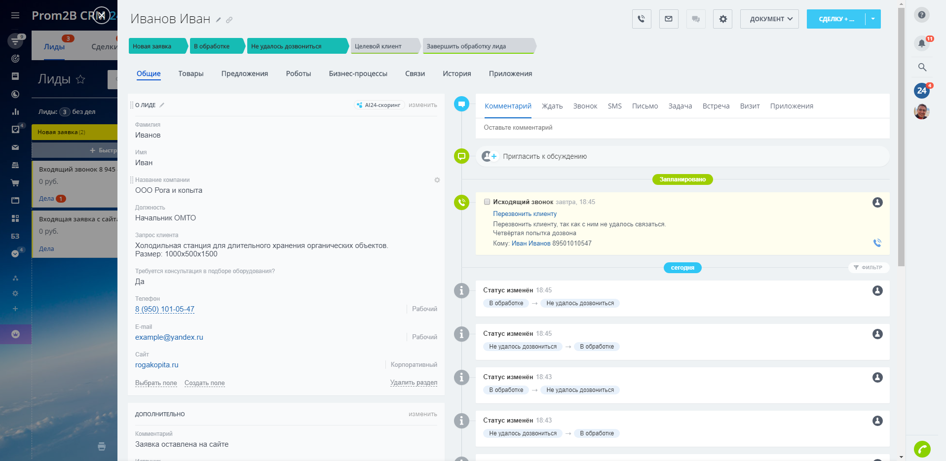 Если клиент целевой, но ему нужна консультация по подбору оборудования, менеджер заполняет необходимое поле, и специалисту, который помогает выбрать товар, автоматически ставится задача.