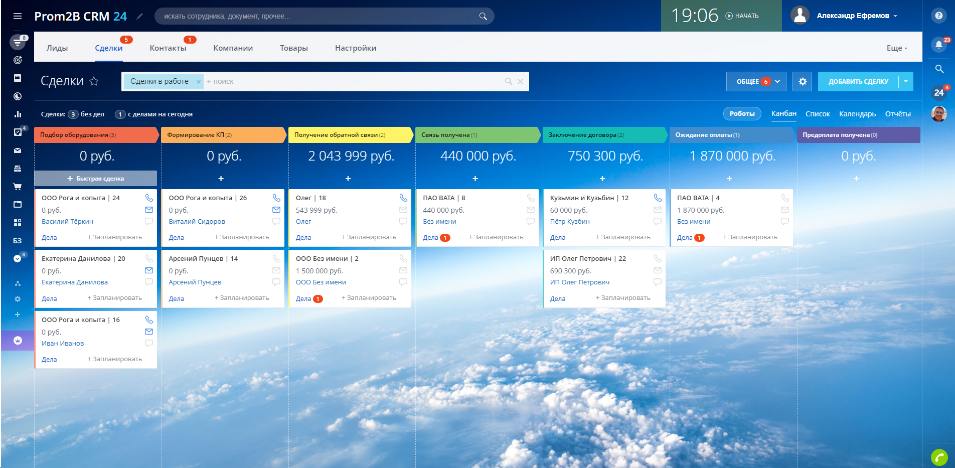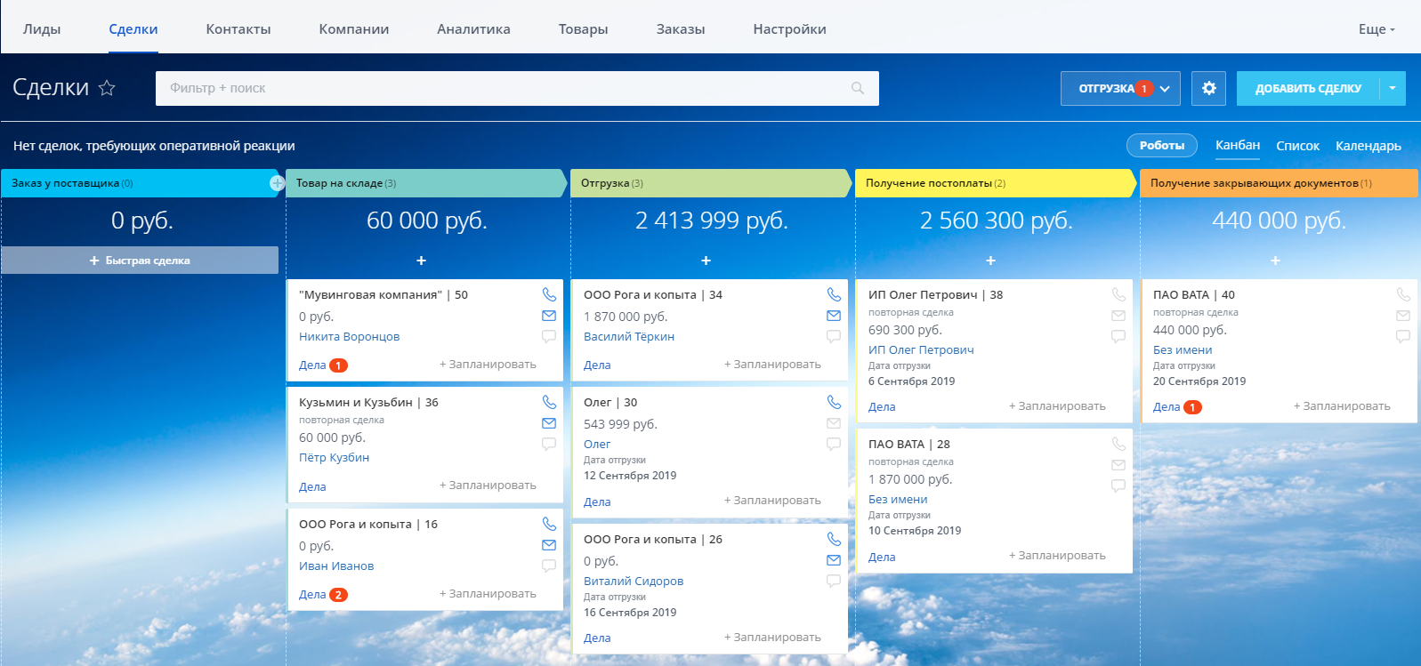 Когда клиент соглашается с вашим КП, сделка переходит на стадию формирования договора и счета. Ответственным сотрудникам автоматически назначаются задачи.