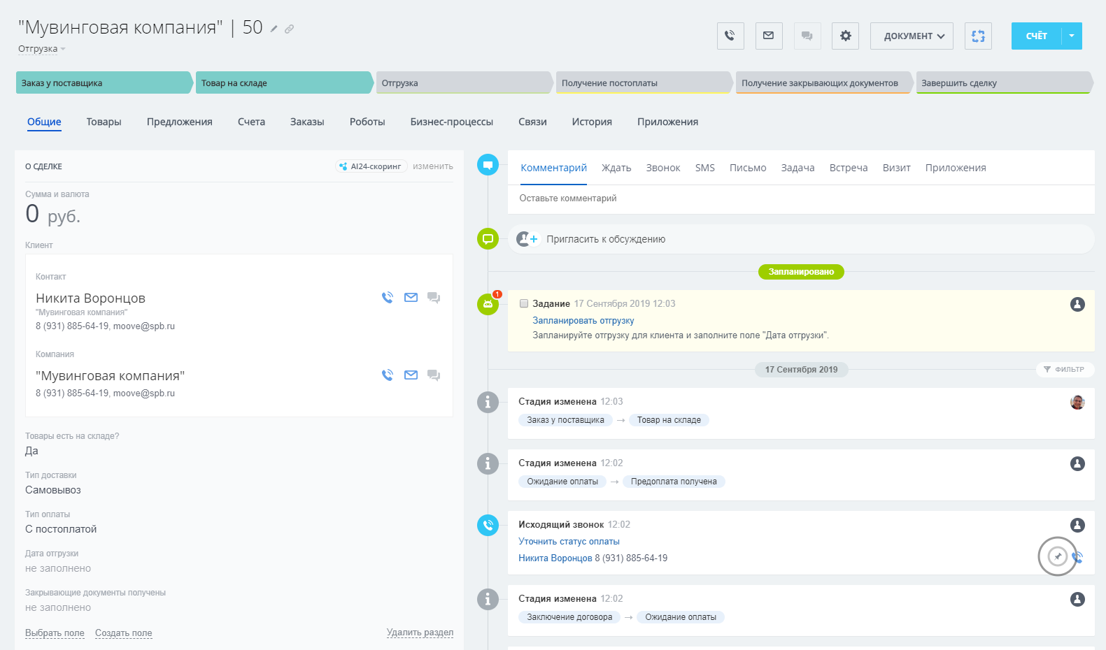 - Автоматическая постановка задачи по закупке недостающих товаров. Если товар уже имеется на складе, стадия Сделки меняется автоматически;