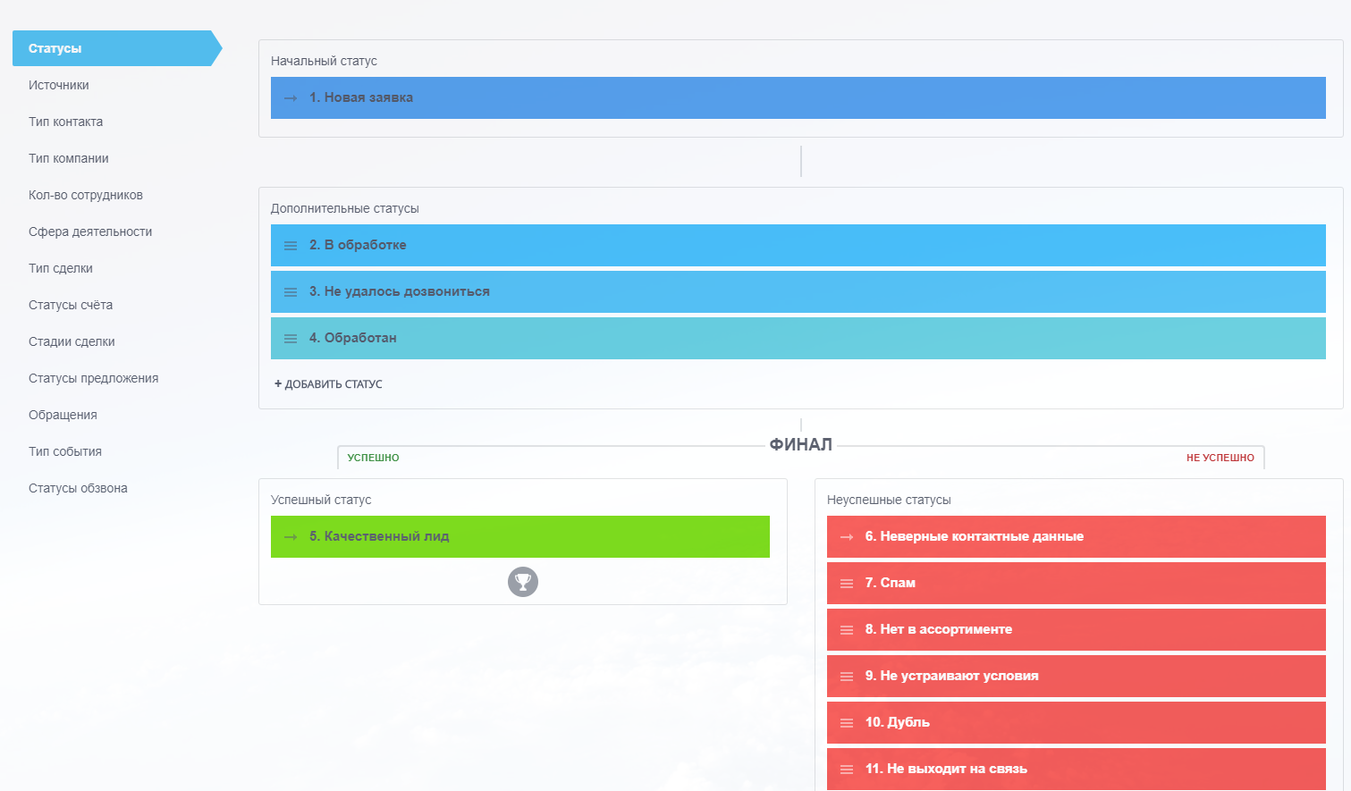Для задач вашего бизнеса настроены стадии и воронка лидов, карточки лидов, стадии и воронка сделок, карточки сделок, контактов и компании.