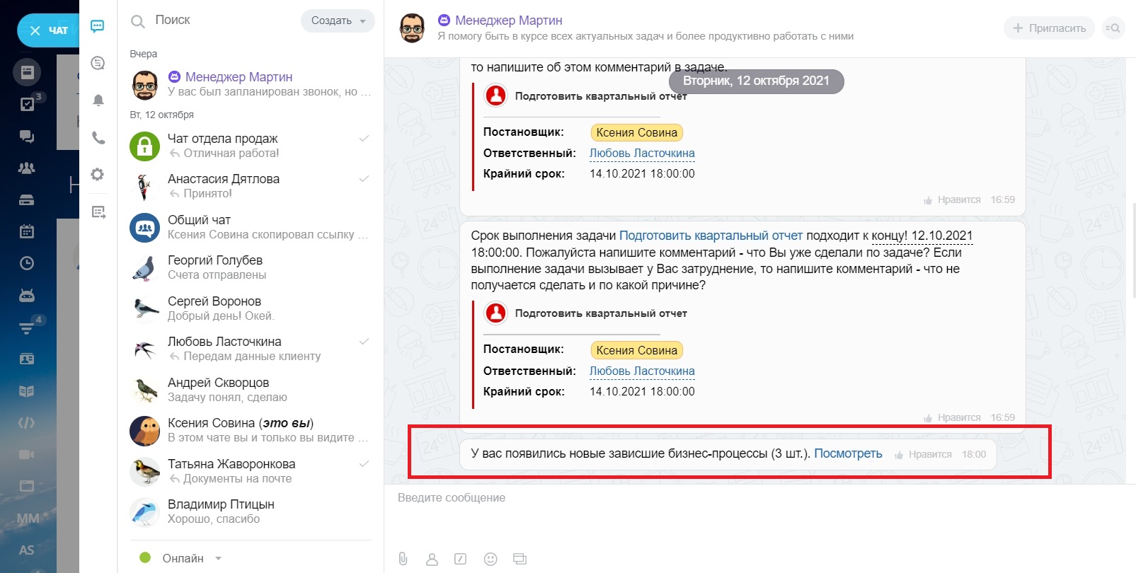- Мартин уведомляет менеджера о новых задачах. Бот пришлет сообщение, когда сотруднику поставят новую задачу. Уведомление о задаче не потеряется в общем списке уведомлений портала, и менеджер легко спланирует работу над ней.