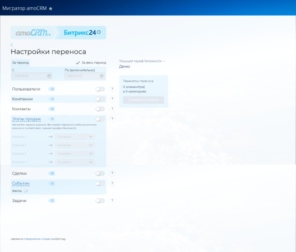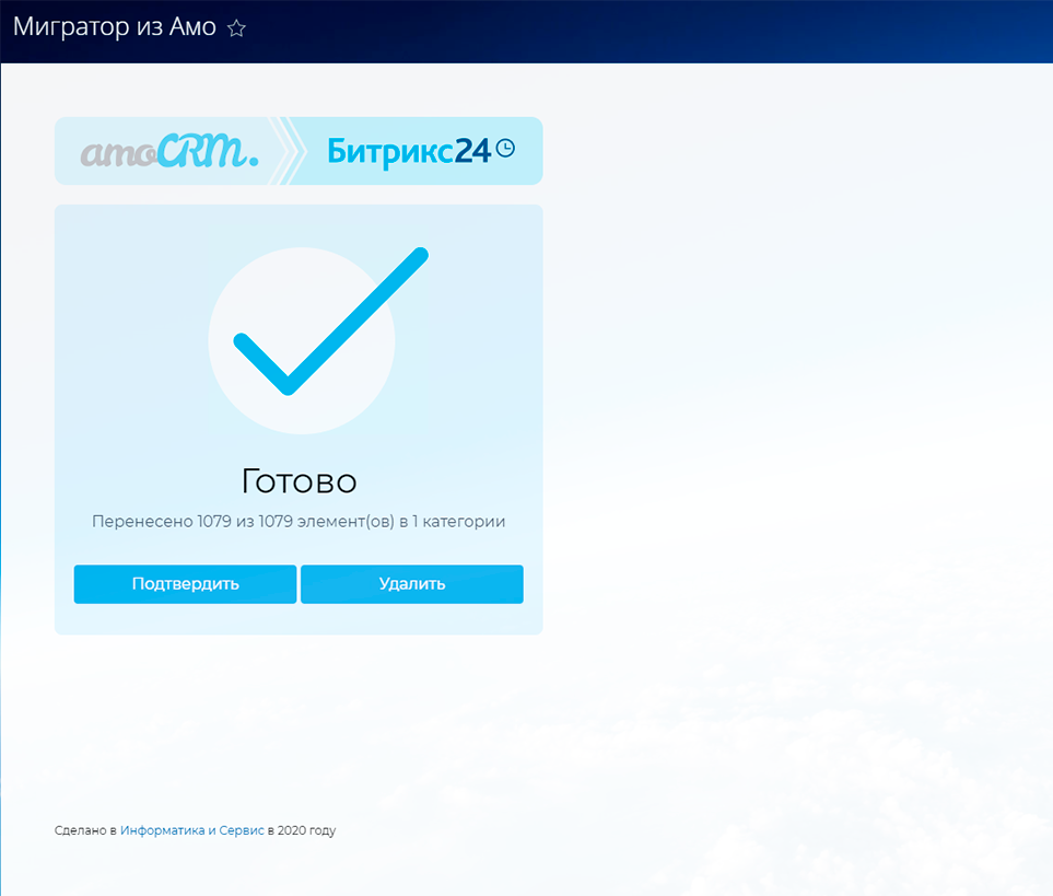 Приложение поможет самостоятельно переехать из amoCRM в CRM Битрикс24 полностью бесплатно. Вся информация будет в безопасности: Мигратор не изменяет и не удаляет данные на стороне amoCRM.