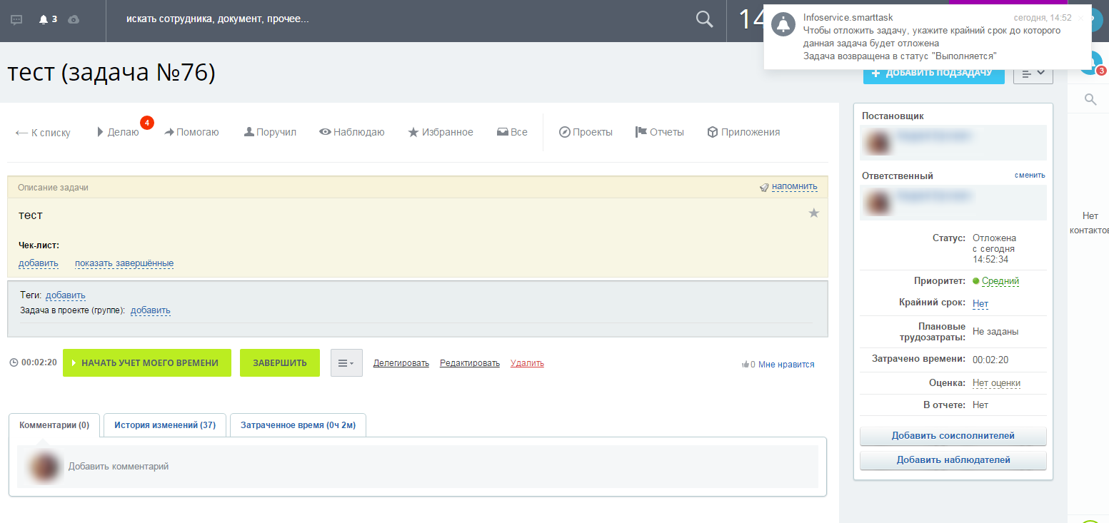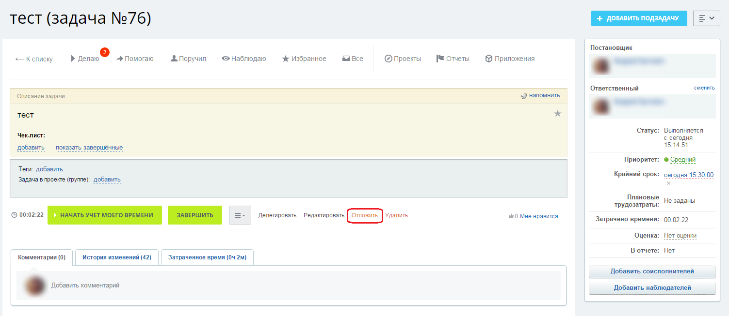 - Нажимаем кнопку «Отложить». Задача переходит в статус отложенных.