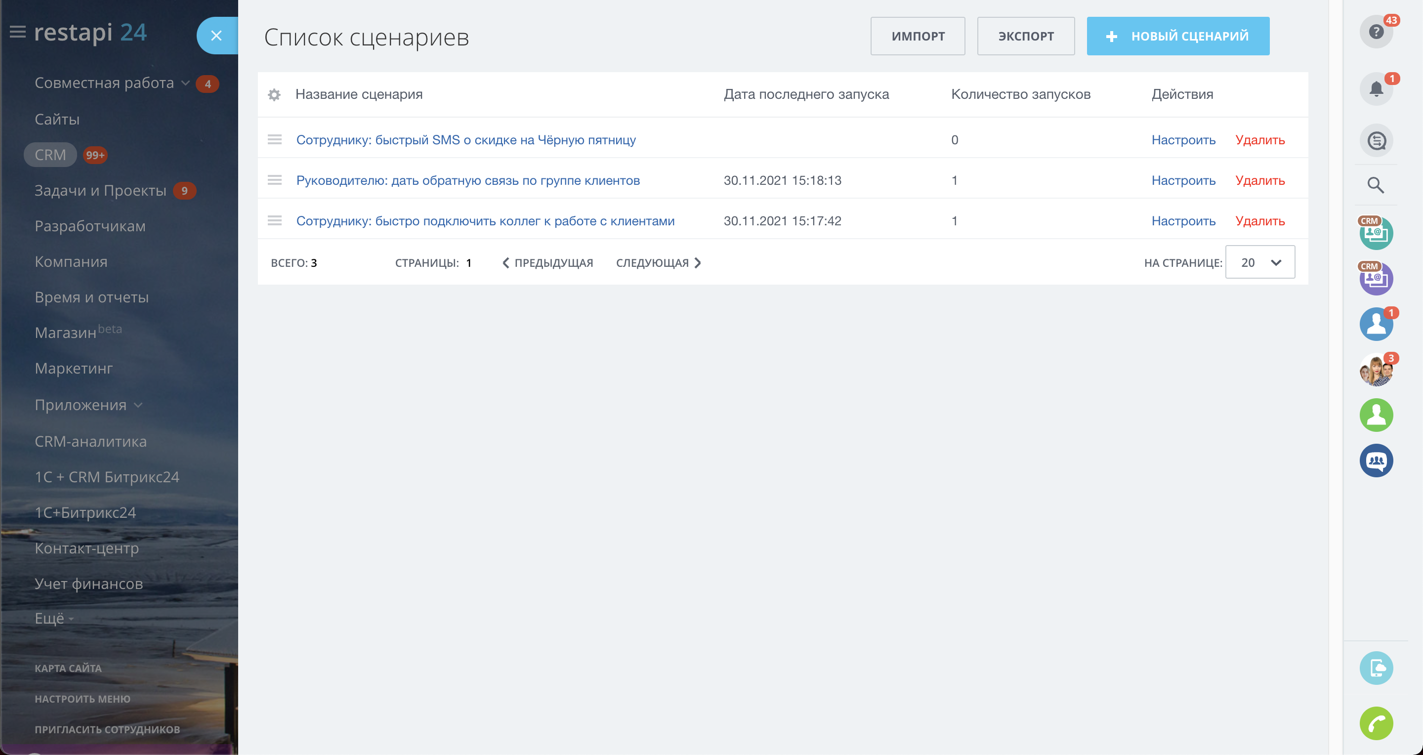После установки зайдите в настройки каждого сценария и убедитесь, что все опции вас устраивают. Не забудьте настроить SMS-провайдер в Контакт-центре, чтобы использовать сценарий с отправкой SMS!