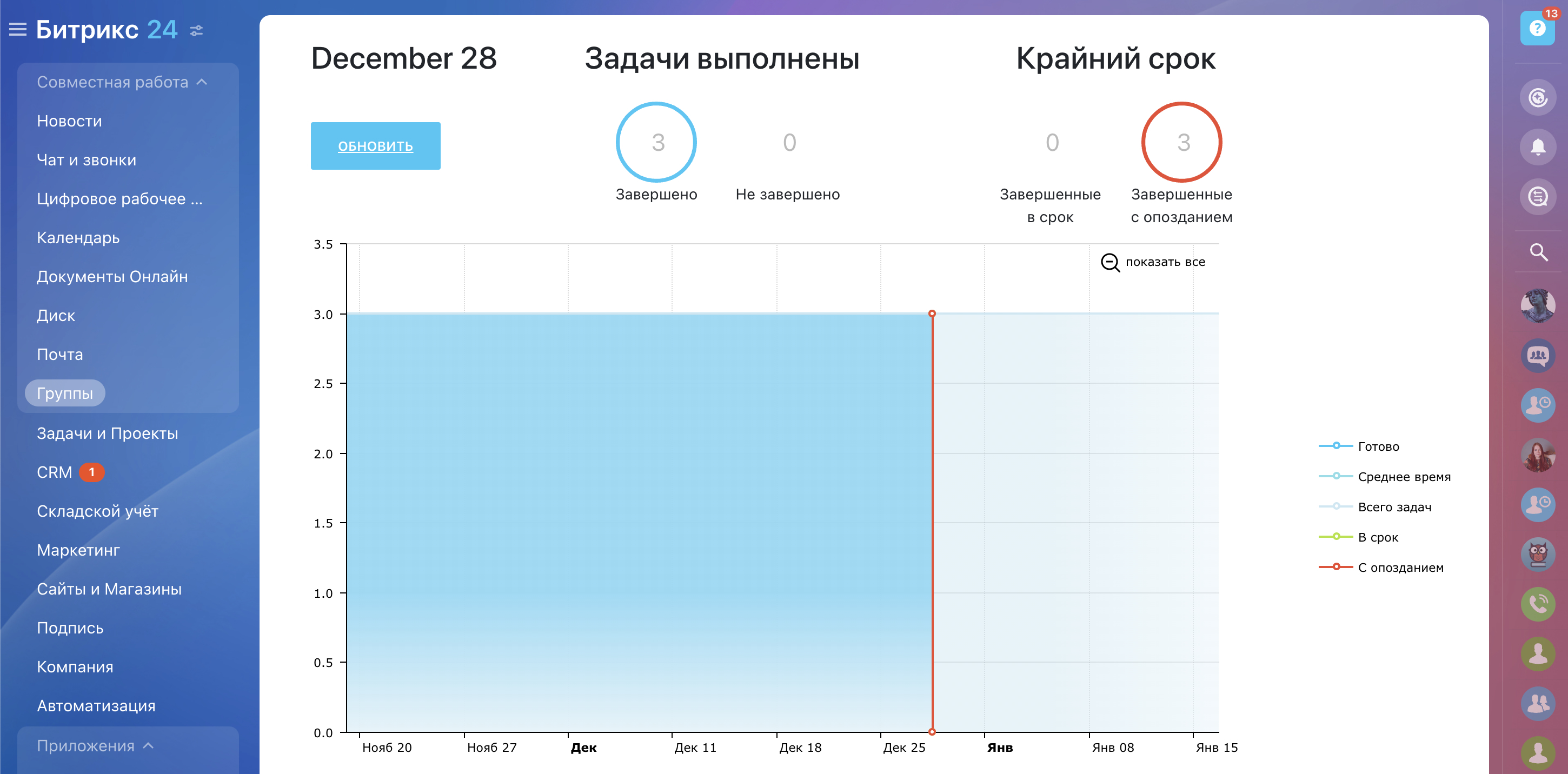 ● На диаграмме «Срок выполнения задачи» показано, сколько задач выполнено по отношению к сроку.