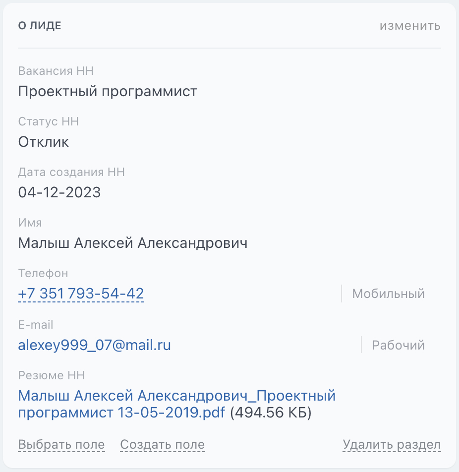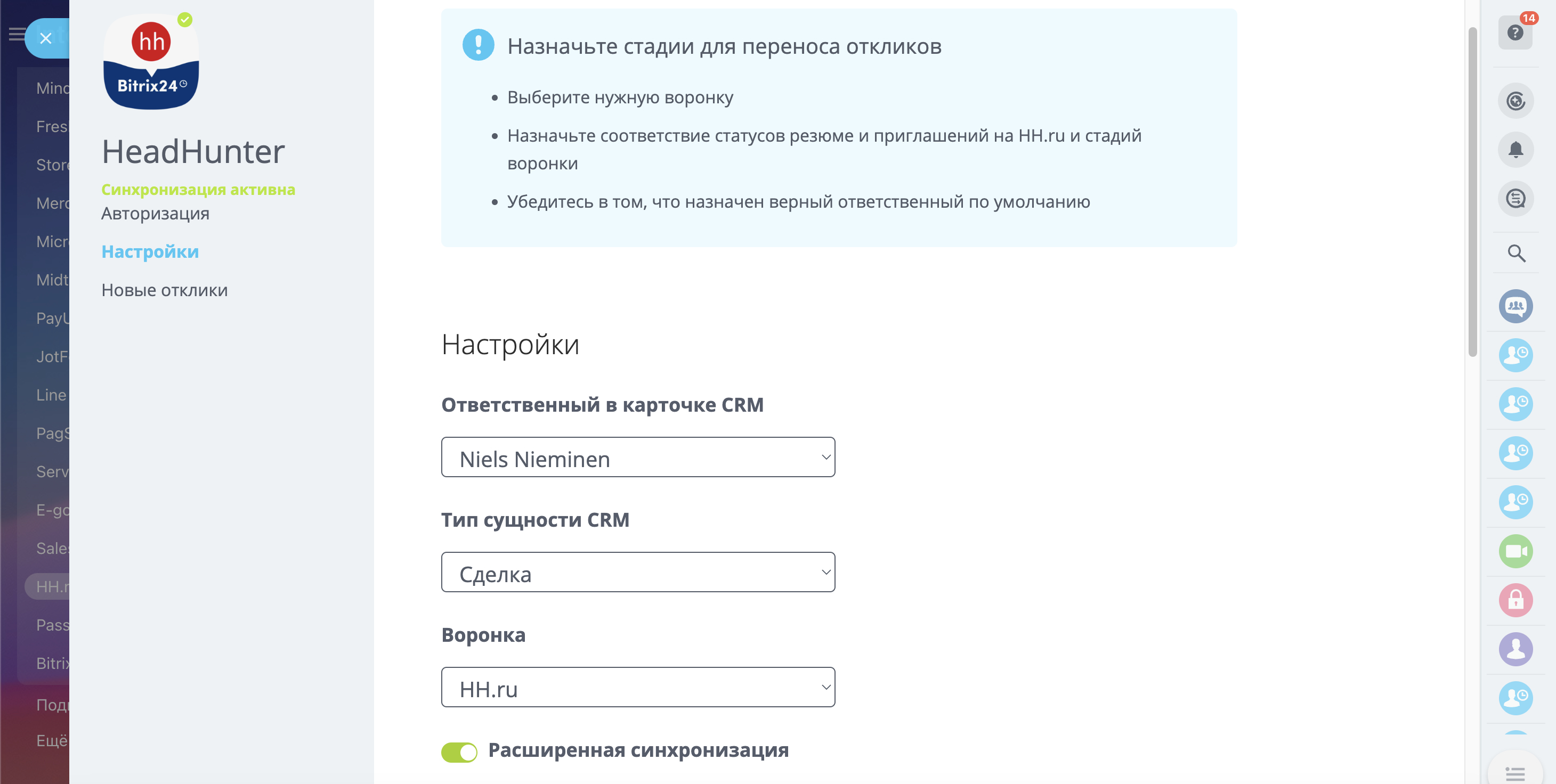 Для многих клиентов вести HR-процессы найма в отдельной воронке кандидатов — удобный сценарий. В текущей версии мы подгружаем основные данные по соискателю, откликам и приглашениям с возможностью удобного доступа к этим данным на платформе. Планируем развивать приложение и дальше. Понимаю, что решение не является универсальным. Вы можете оставить заявку нашим сертифицированным партнерам, которые помогут быстро найти оптимальное решение для вашей компании: https://www.bitrix24.ru/partners/