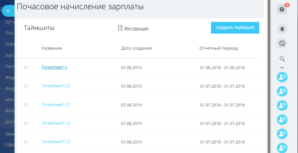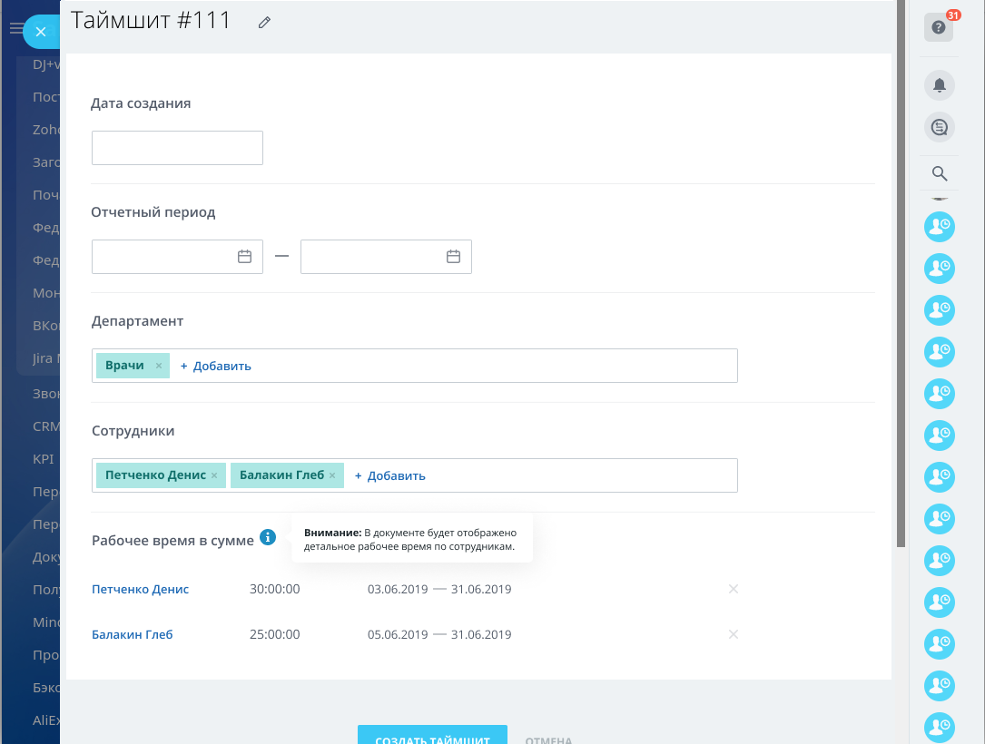 Приложение позволяет создавать отчеты за определенный промежуток времени без ограничений. Приложение может создавать отчет как по отделу, так и по конкретным сотрудникам. Вы можете скачать созданный таймшит в DOCX или экспортировать его в CSV для последующей интеграции с внешними сервисами. Приложение поможет руководящему составу или бухгалтерии контролировать работу, распределять ресурсы компании и рассчитывать фонд оплаты труда в соответствии с фактическими затратами времени по тем или иным задачам.