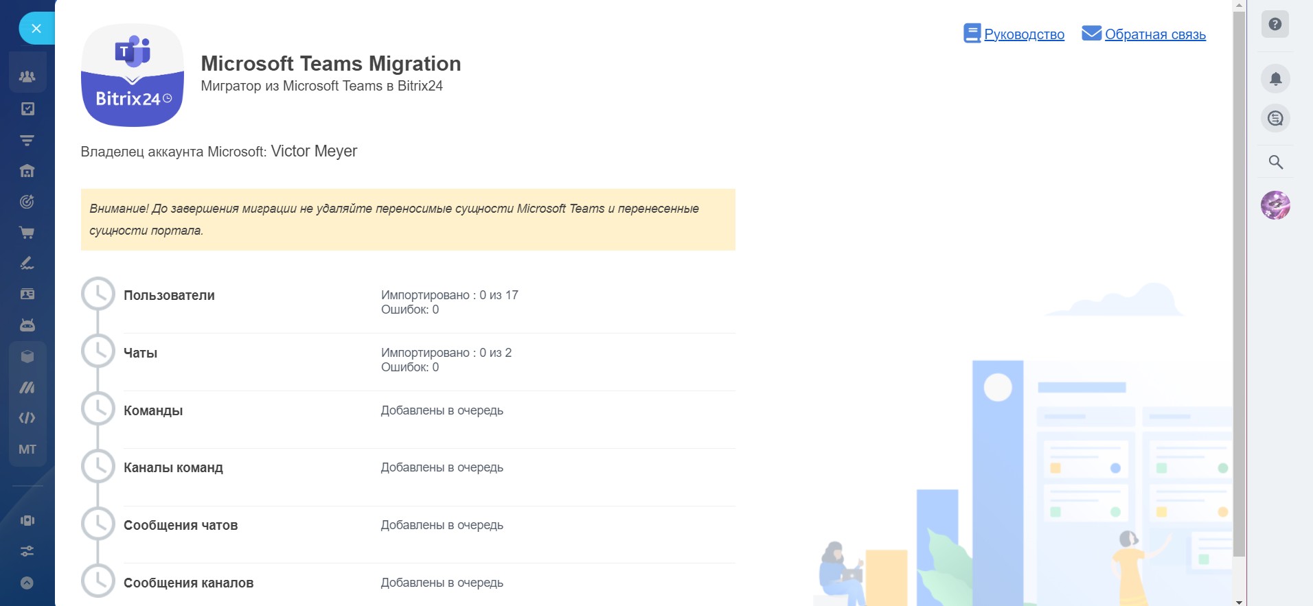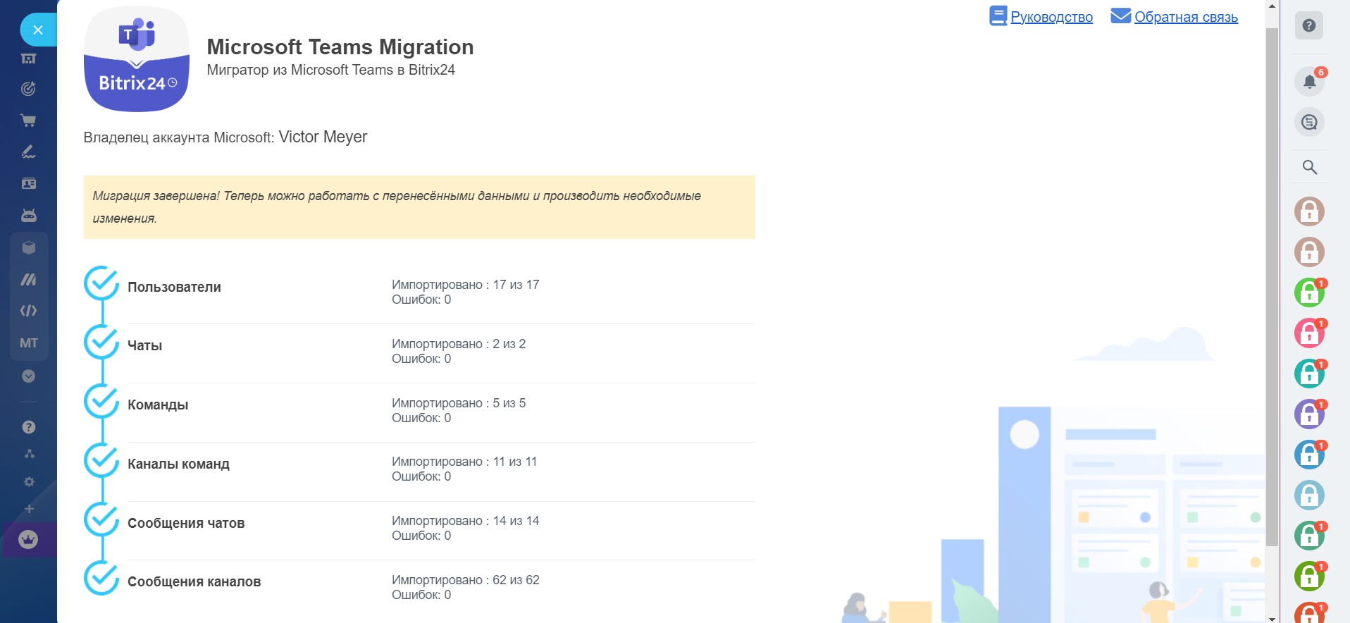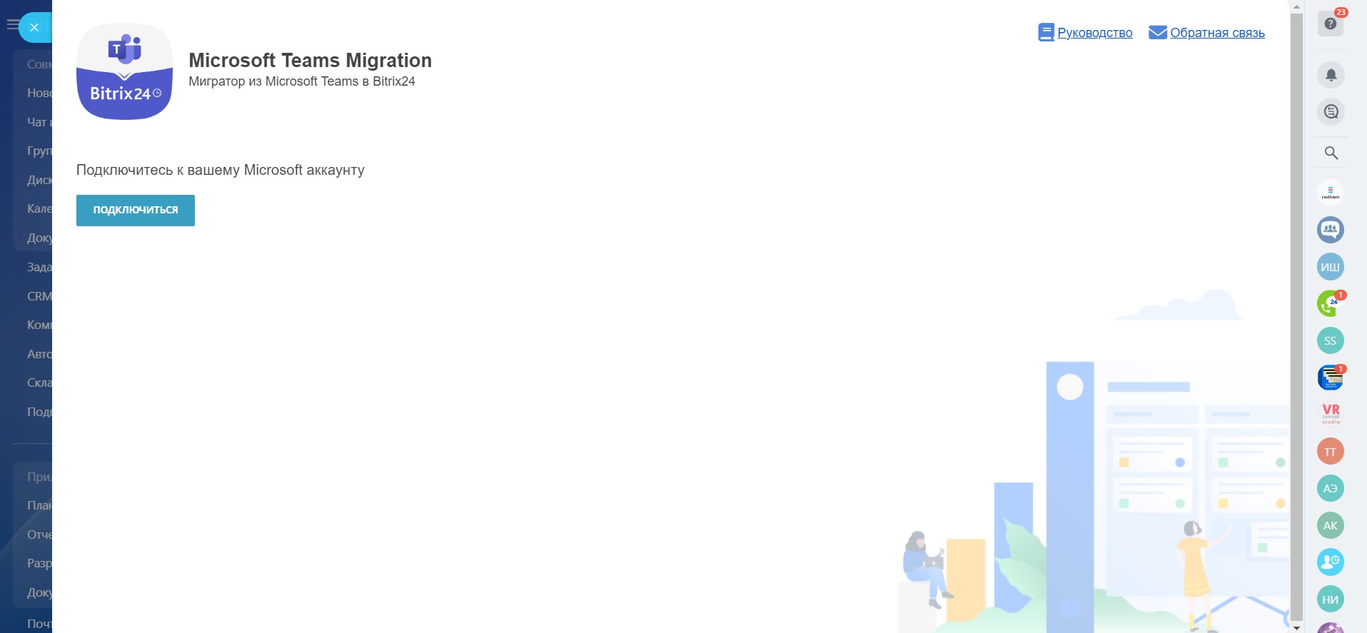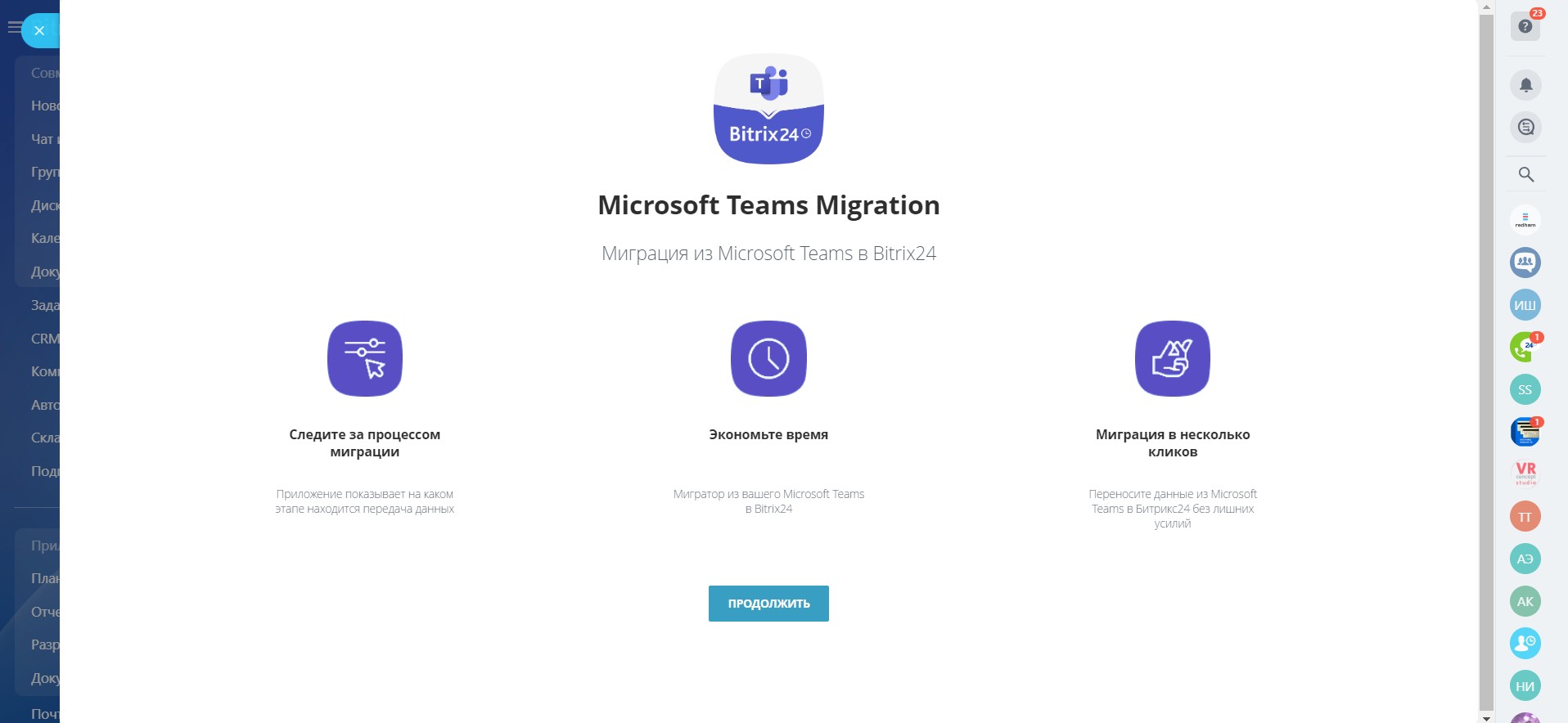 Microsoft Teams Migration — комплексное решение, разработанное специально для Битрикс24. С его помощью вы сможете продолжить успешную коллективную работу и перенести все ключевые данные вашего бизнеса. Мигратор позволяет перенести сообщения и файлы чатов и каналов, импортирует пользователей, чаты, команды, каналы, сообщения и файлы.
