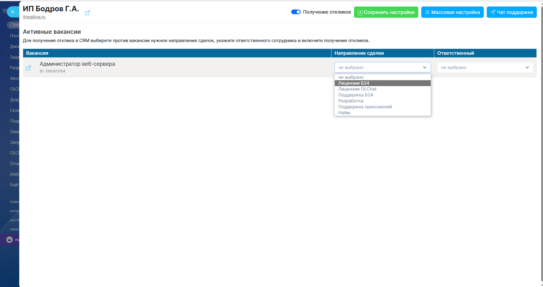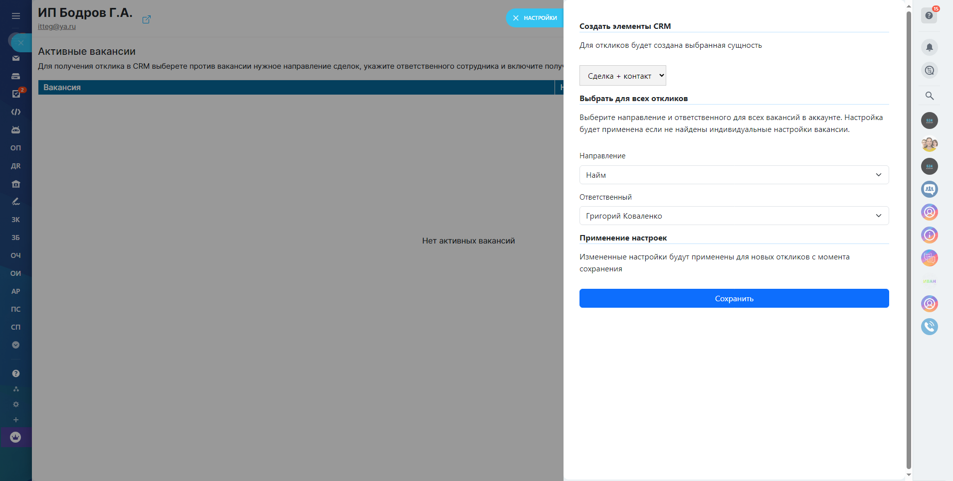 Если у вас есть активные вакансии - напротив каждой из них выберете направление и ответственного сотрудника. Или задайте общие настройки для всего аккаунта в слайдере Настройки. В настройках же выберете сущность CRM, которая будет создана для новых откликов.