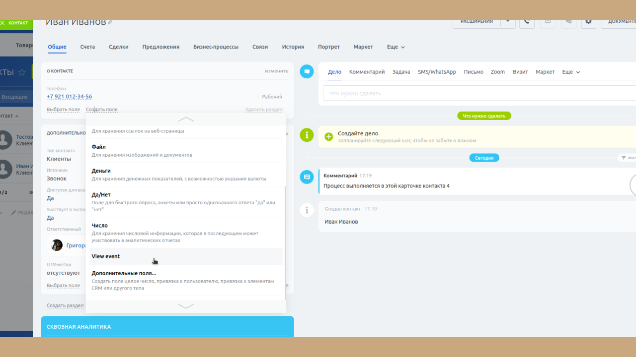 1. Приложение создает пользовательское поле с типом view event, которое необходимо вывести (отметить опцию показывать всегда в настройках поля) в карточках сделки, лида, компании и контакта в CRM.