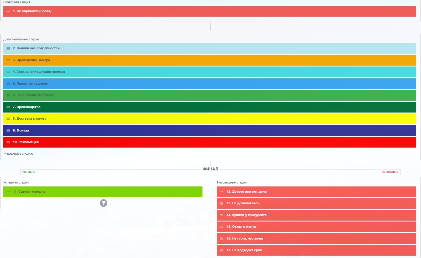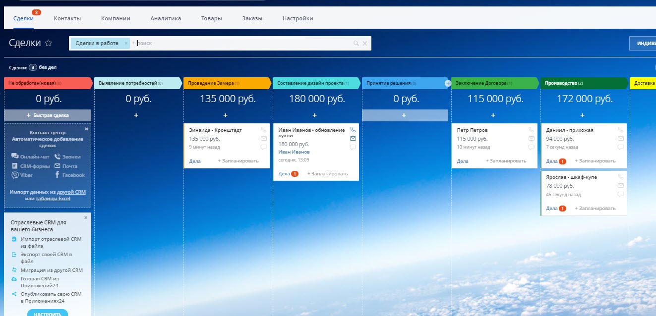 В данном решении Битрикс24 настроен под специфику индивидуального изготовления мебели. Вы сможете отслеживать статус каждой сделки - поступление, замер, дизайн, производство, монтаж, рекламации и пр.