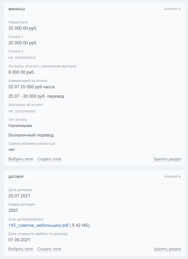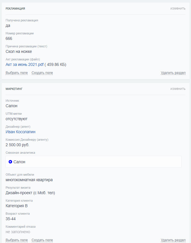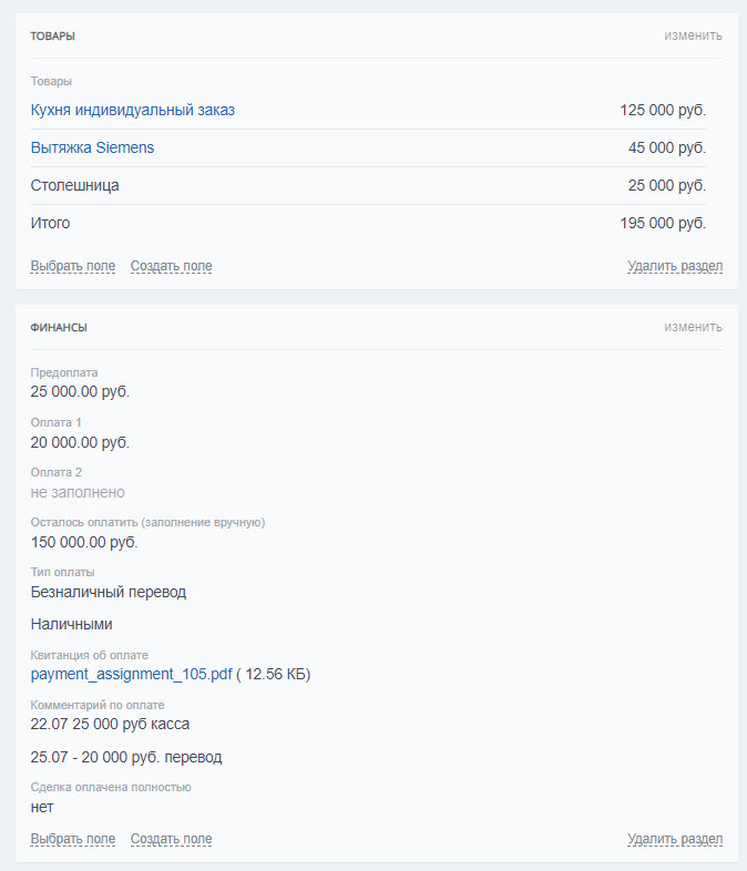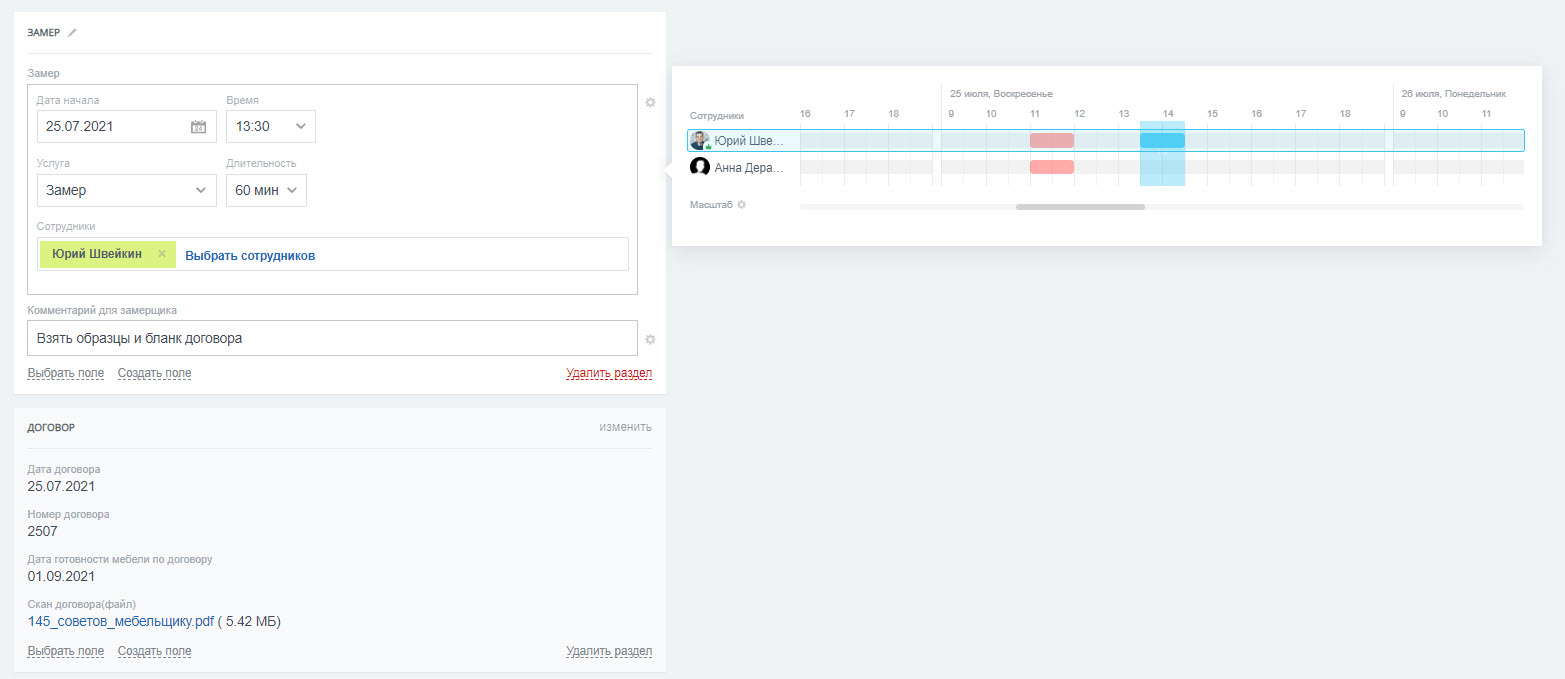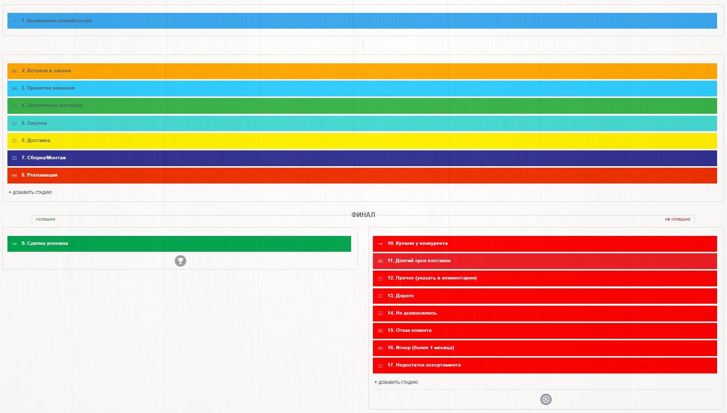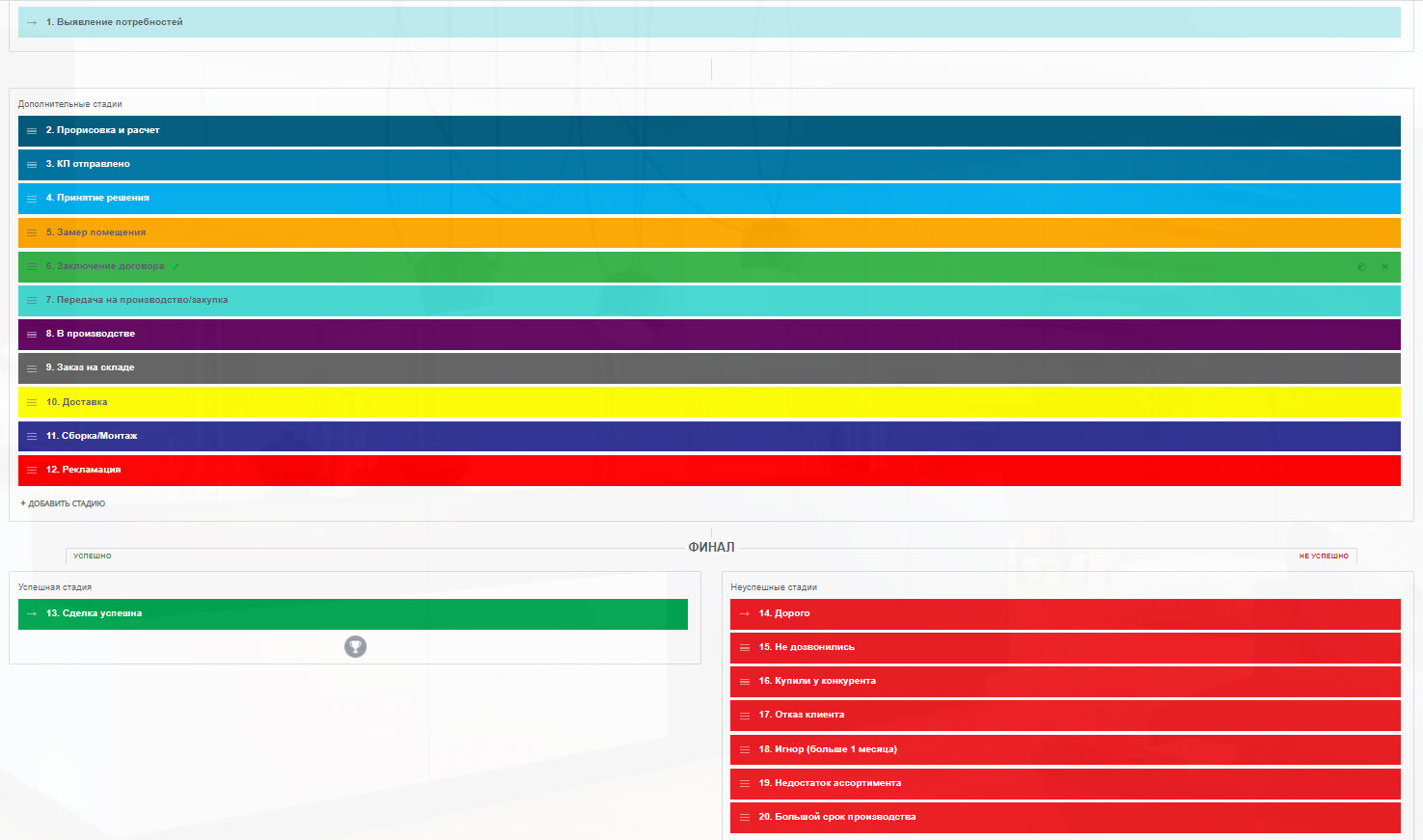 В данном решении Битрикс24 настроен под 2 розничных направления : 1. Индивидуальное изготовления мебели - кухни, шкафы-купе, гардеробные, пр. 2. Серийная продукция - столы, стулья, диваны, кровати и п.р