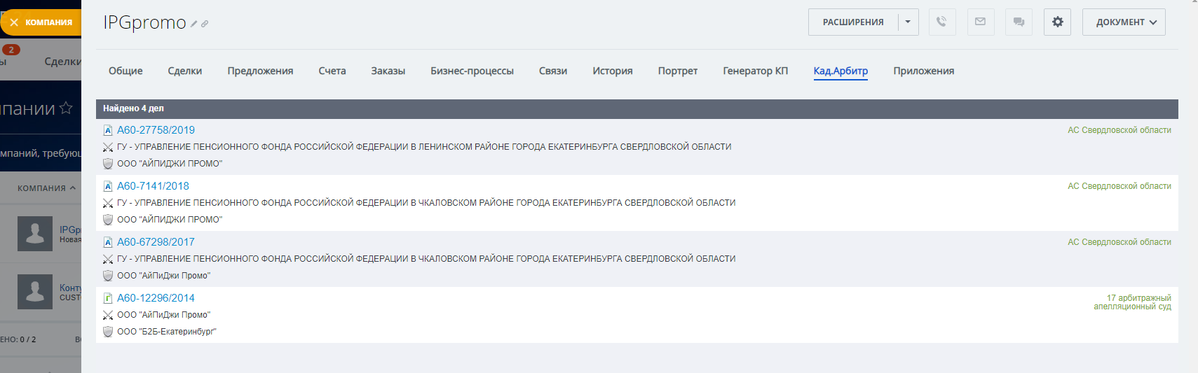 Арбитраж - приложение представляет собой интегрированную в CRM версию информационной системы «Картотека Арбитражных Дел» Высшего Арбитражного Суда Российской Федерации. С помощью него вы можете получить актуальную информацию о делах, рассматриваемых в арбитражных судах Российской Федерации по компании, прямо у вас в CRM. Пользователю доступна полная хронология рассмотрения дела во всех инстанциях:
