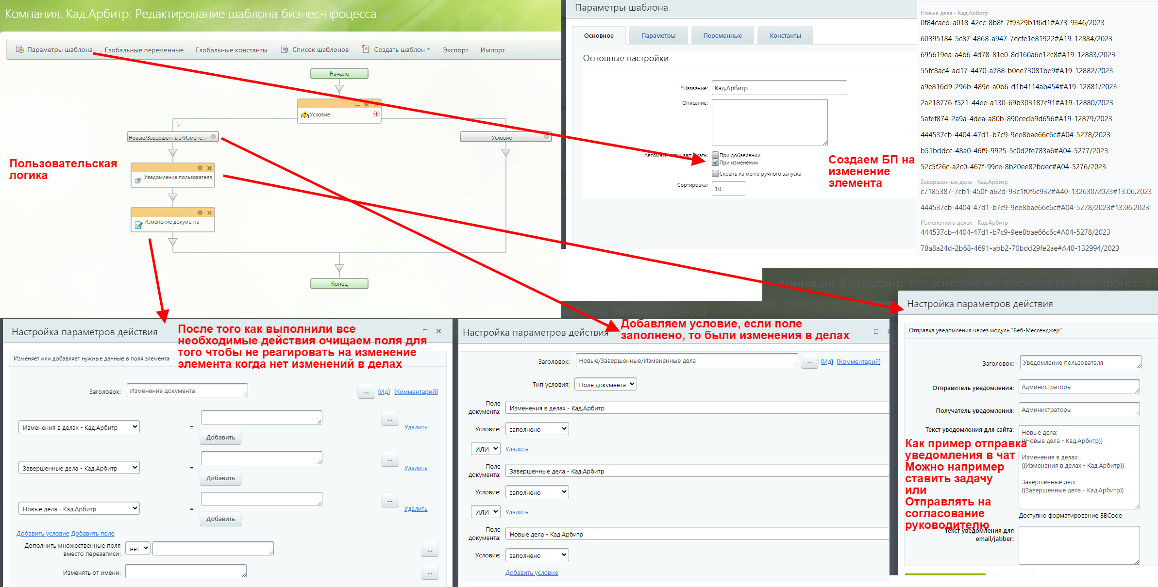 Добавлены множественные поля: 'Новые дела', 'Изменения в делах', 'Завершенные дела'. Предназначены в первую очередь для использования в автоматизациях. В бизнес-процессе можно контролировать изменение этих полей и запускать произвольные действия. Например, при появлении новых дел, поставить задачу со списком новых дел.