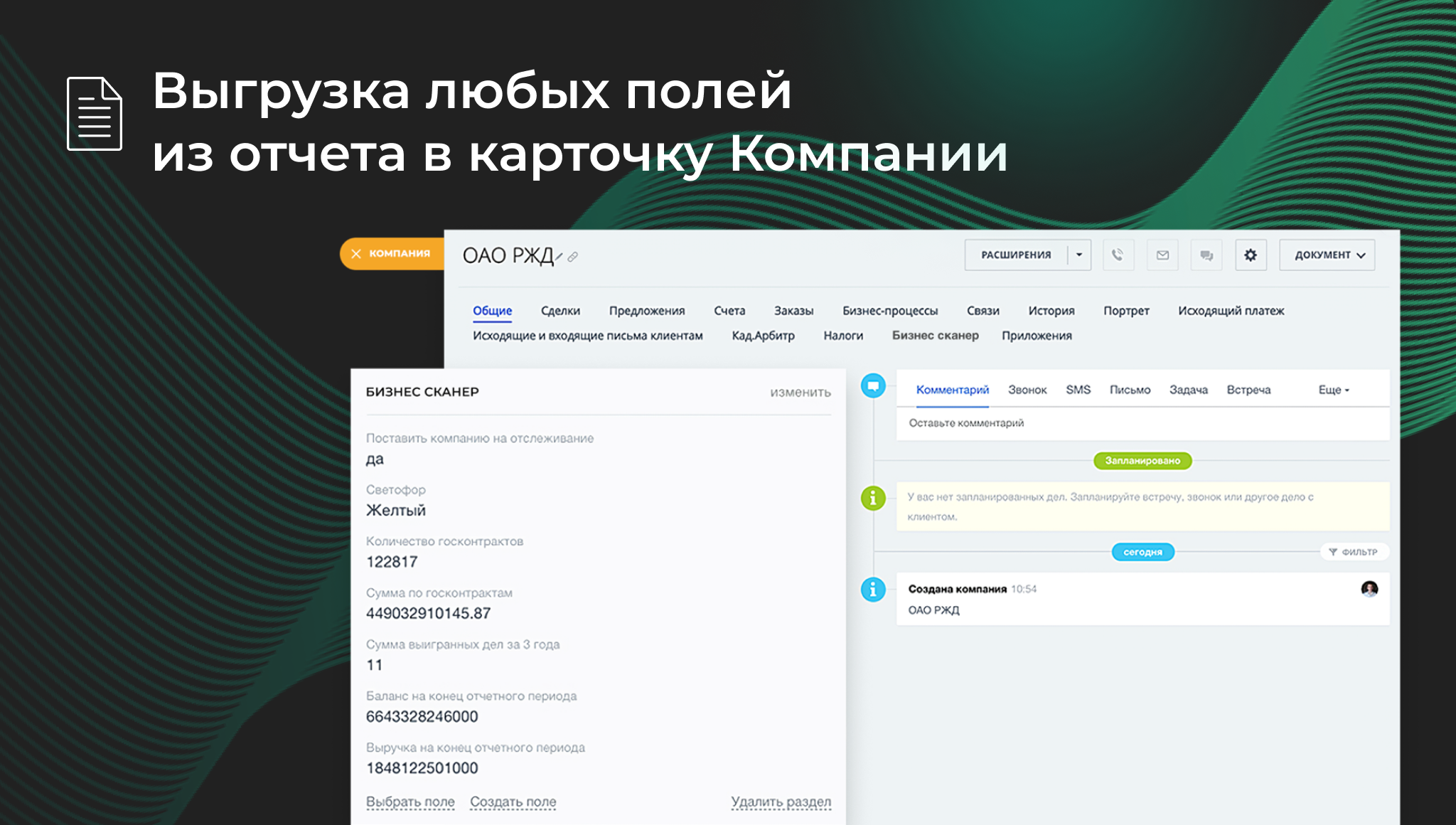 • Возможность выбора и выгрузки любых полей из отчета Бизнес Сканер в карточку компании.