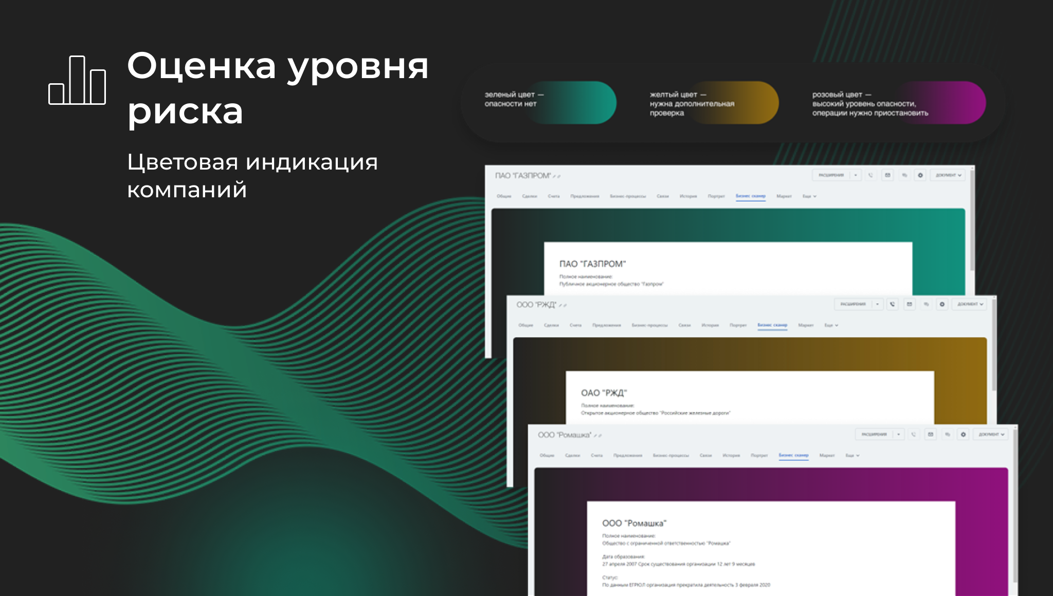 • Оценка уровня риска. В результате проверки выявляется цветовая категория риска контрагента, где зеленый цвет означает, что опасности нет, желтый — нужна дополнительная проверка, красный — высокий уровень опасности, операции нужно приостановить.