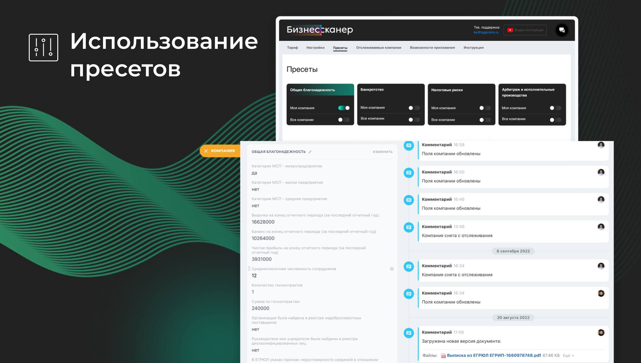 Особенностью приложения является его простота настройки и использования. Мы понимаем, что микро- и малый бизнес зачастую не имеет в штате юристов и службы безопасности, при этом потребность проверять клиентов и подрядчиков у них есть. Именно поэтому мы в сотрудничестве с опытными юристами создали готовые пресеты (блоки с наиболее важными для проверки и мониторинга показателями контрагентов). Пресеты включаются одним кликом мыши и вы начинаете использовать приложение.