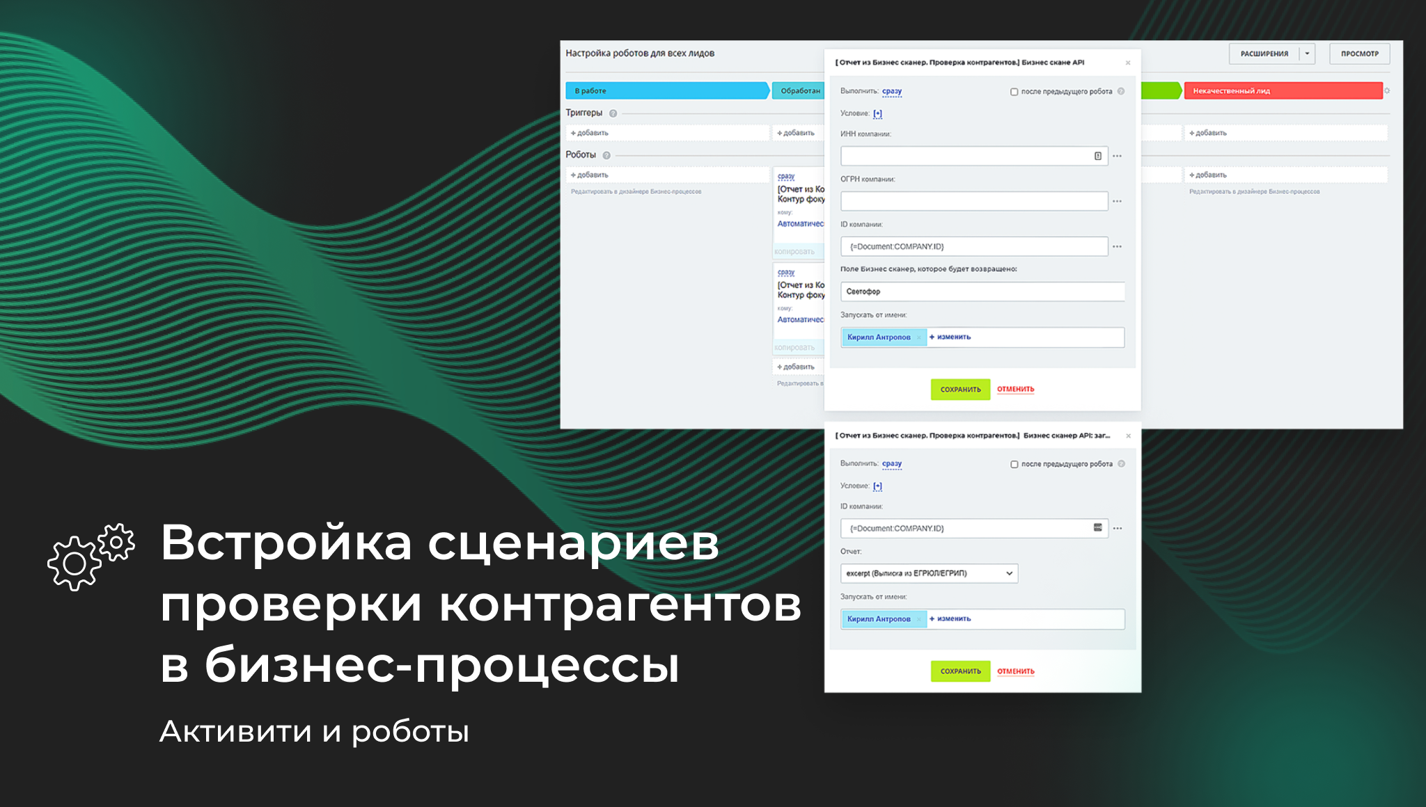 • Активити и роботы в бизнес-процессах, с помощью которых можно получить выбранные данные из отчета Бизнес Сканер, скачать быстрый отчет, выписку из ЕГРЮЛ, интегрировать сценарии проверок контрагентов в существующие бизнес-процессы компании.