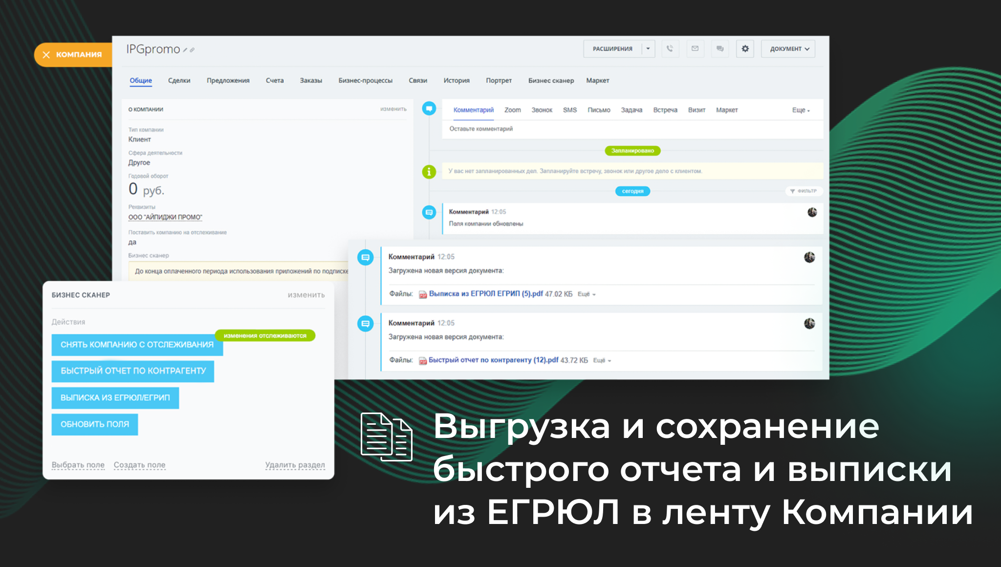 • Выгрузка и сохранение быстрого отчета и выписки из ЕГРЮЛ в PDF в ленту компании. Чтобы выгрузить отчет в ленту, нажмите на кнопку с названием отчета в карточке компании.