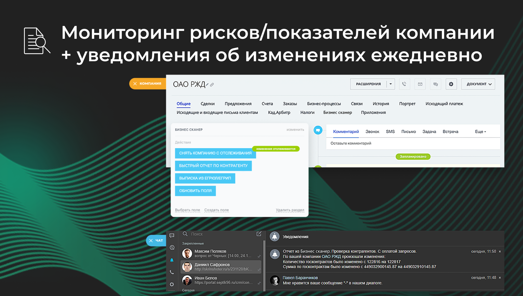 • Мониторинг изменения любых показателей компании с ежедневными уведомлениями об изменениях. Чтобы включить мониторинг, поставьте галочку в карточке компании в поле «Поставить компанию на отслеживание». Уведомления будут приходить в ленту компании и в центр уведомлений ответственному сотруднику.